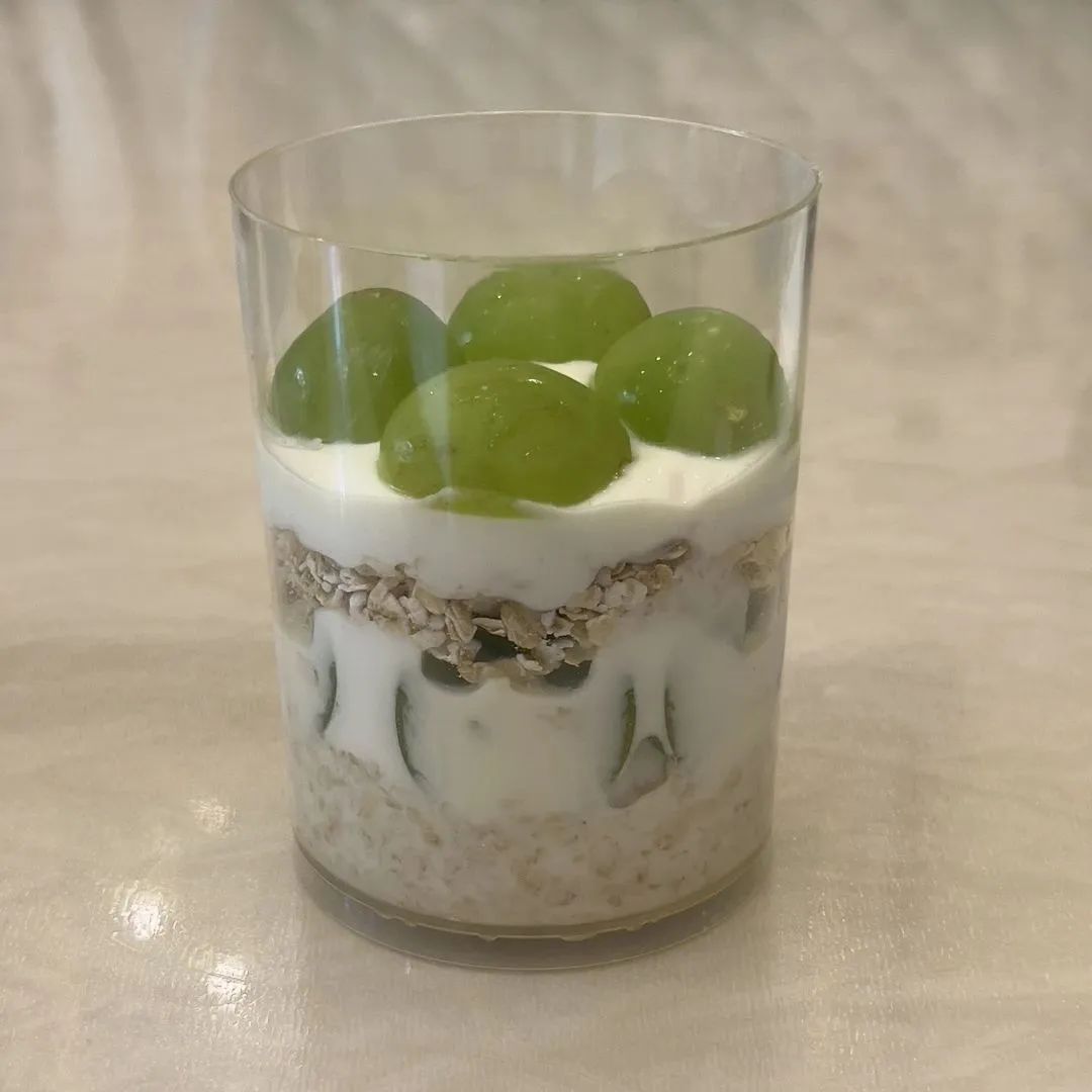 3.在酸奶上平铺对半切开的葡萄,加一层燕麦。