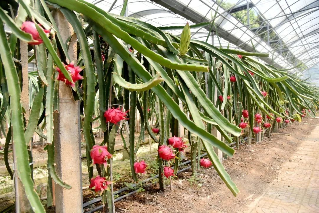 近日,马陆镇宏泰园的火龙果大棚内,一排排类似仙人掌的藤条上,挂满了颗颗鲜艳饱满的火龙果,一派生机勃勃的景象。