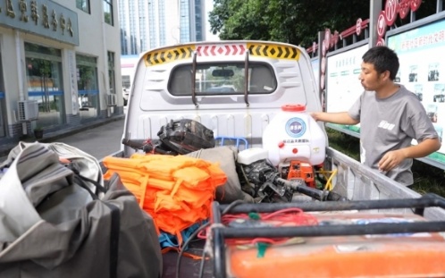 8月1日下午3点多,宿迁北蓝救援服务中心的8名救援队员在市区紧急集合,携带专业设备,准备一路北上,驰援北京等地区的抢险救灾工作。“我们是在7月31日晚上收到的通知,然后根据暴雨备勤须知进行准备。”宿迁北蓝救援服务中心负责人张伟介绍。在进行前期准备时,队员们迅速集结,纷纷出力,有开超市的队员,还专门“搬出”了自家的仓库,提供了水和食物。最终,救援队带齐了抽水泵、皮艇、救生圈和各类消杀的工具后,根据统一指令,正式赶赴受灾地区。