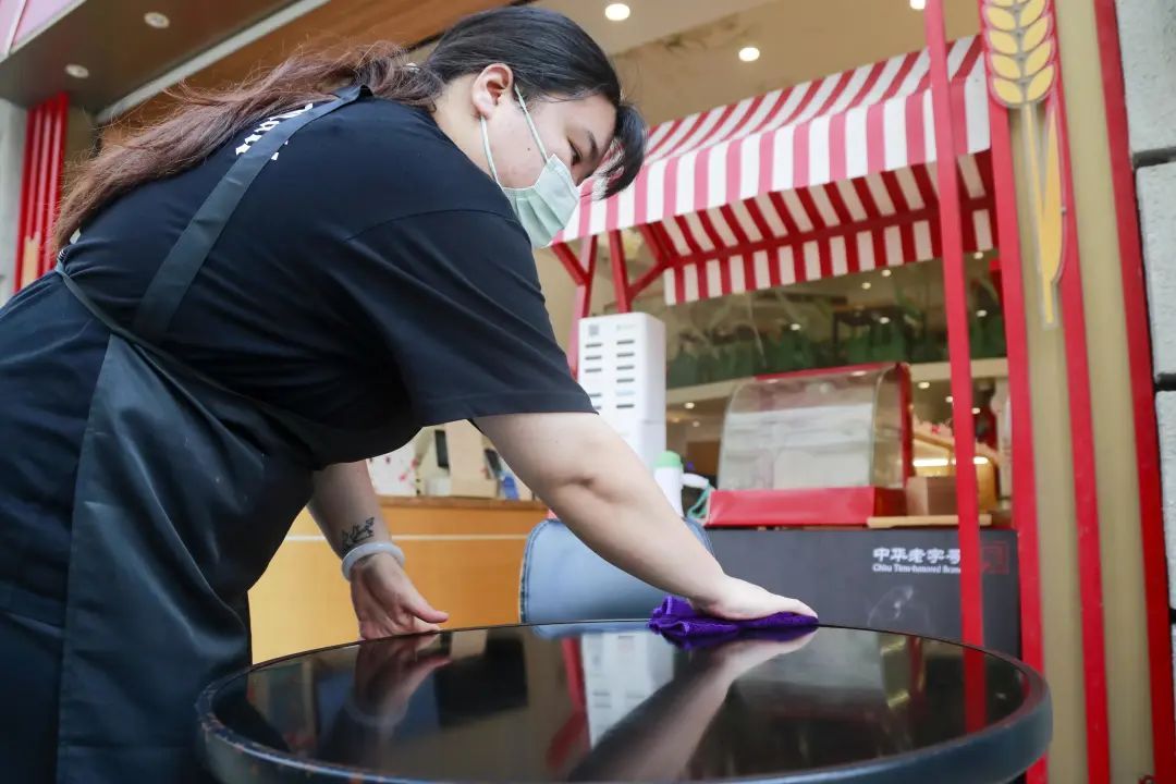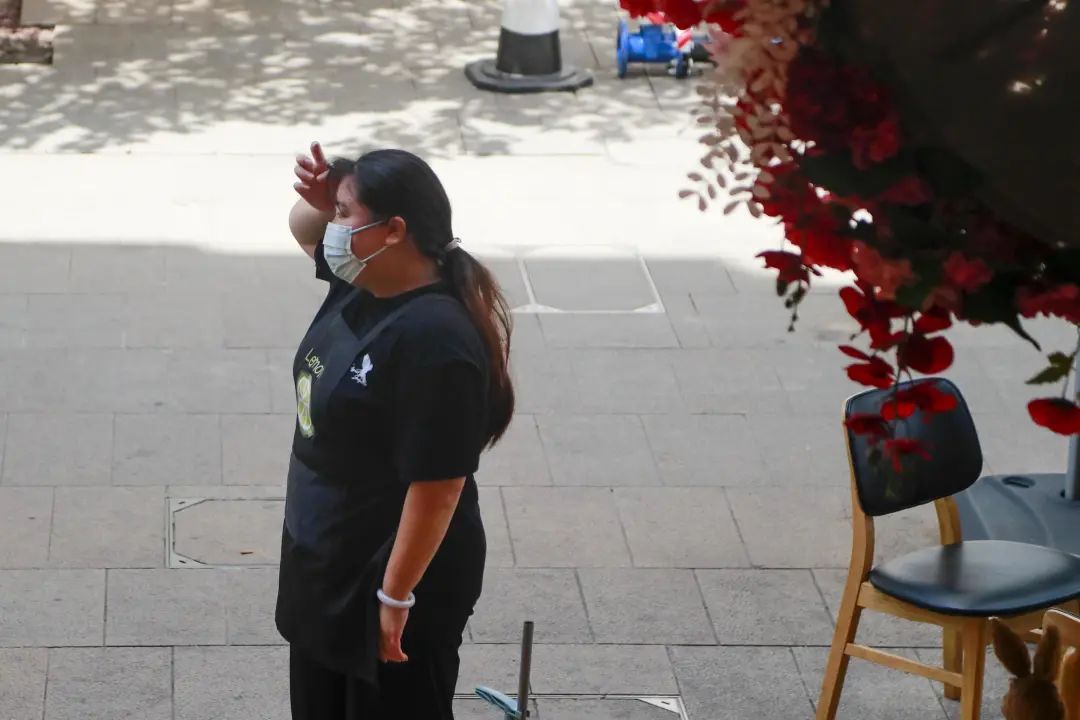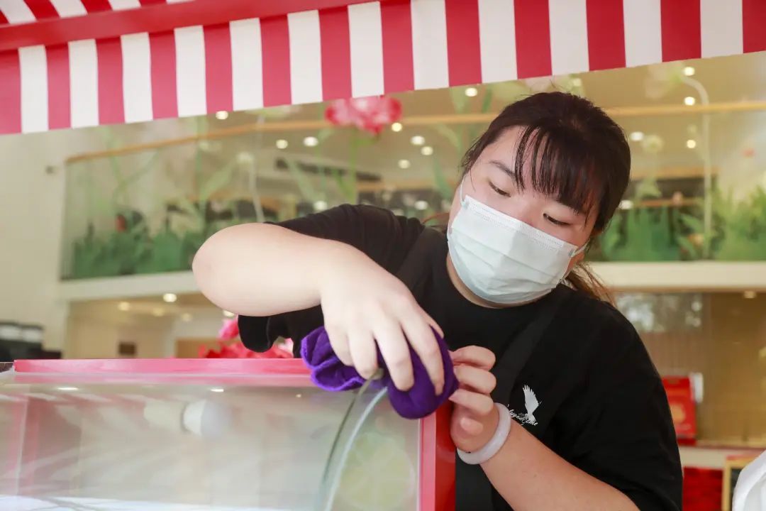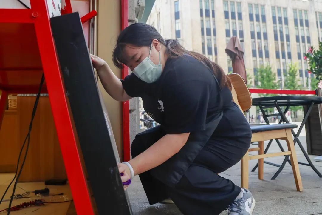 “现在正好是暑假,作为上海必打卡的景点,这里游客很多。”杨玮倩擦拭着店门口的各个角落,告诉记者:“我的主要工作是收银、制作饮品以及室外外摆区的清洁,别看是在室内,但由于店铺是敞开式的设计,没有玻璃门,室内的工作区总是有室外的热风吹进来,动一动就是一身汗。”越靠近门口的工作区温度就越高,有时候甚至会超过三十度。
