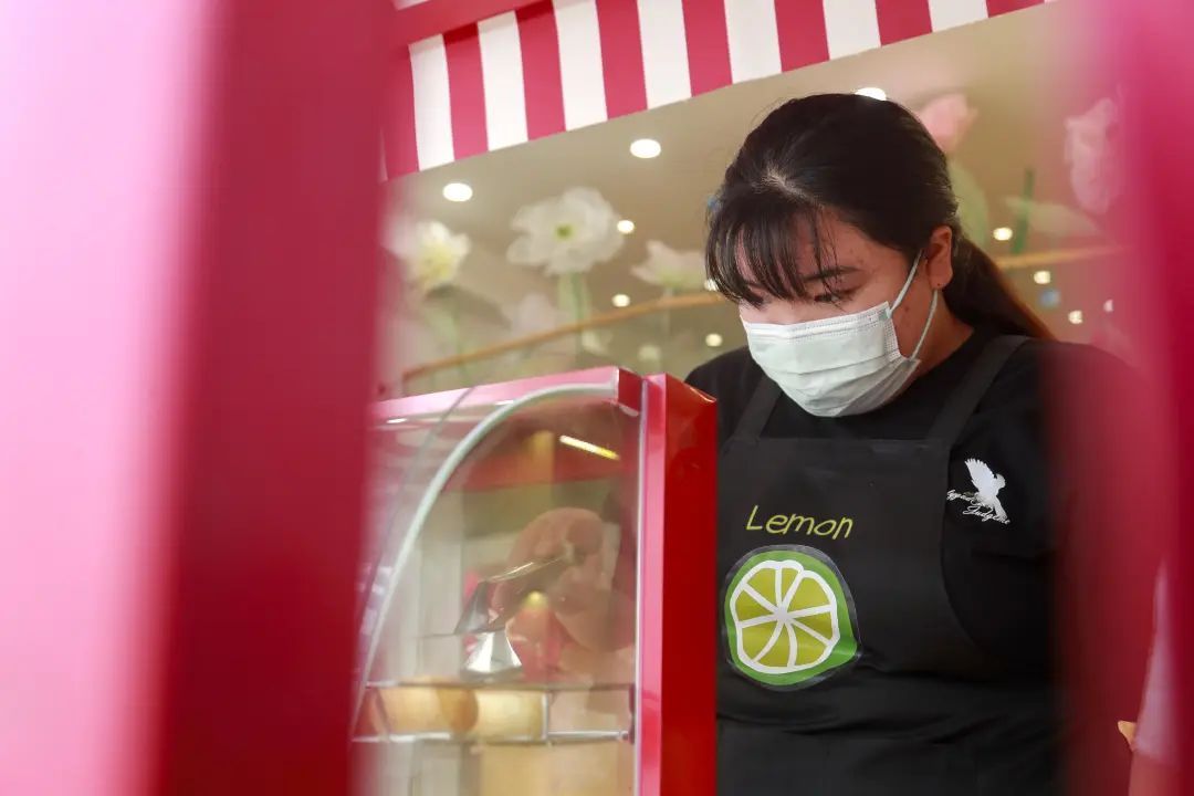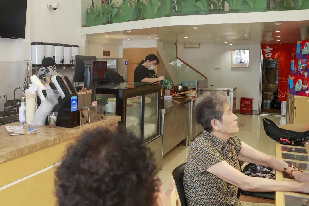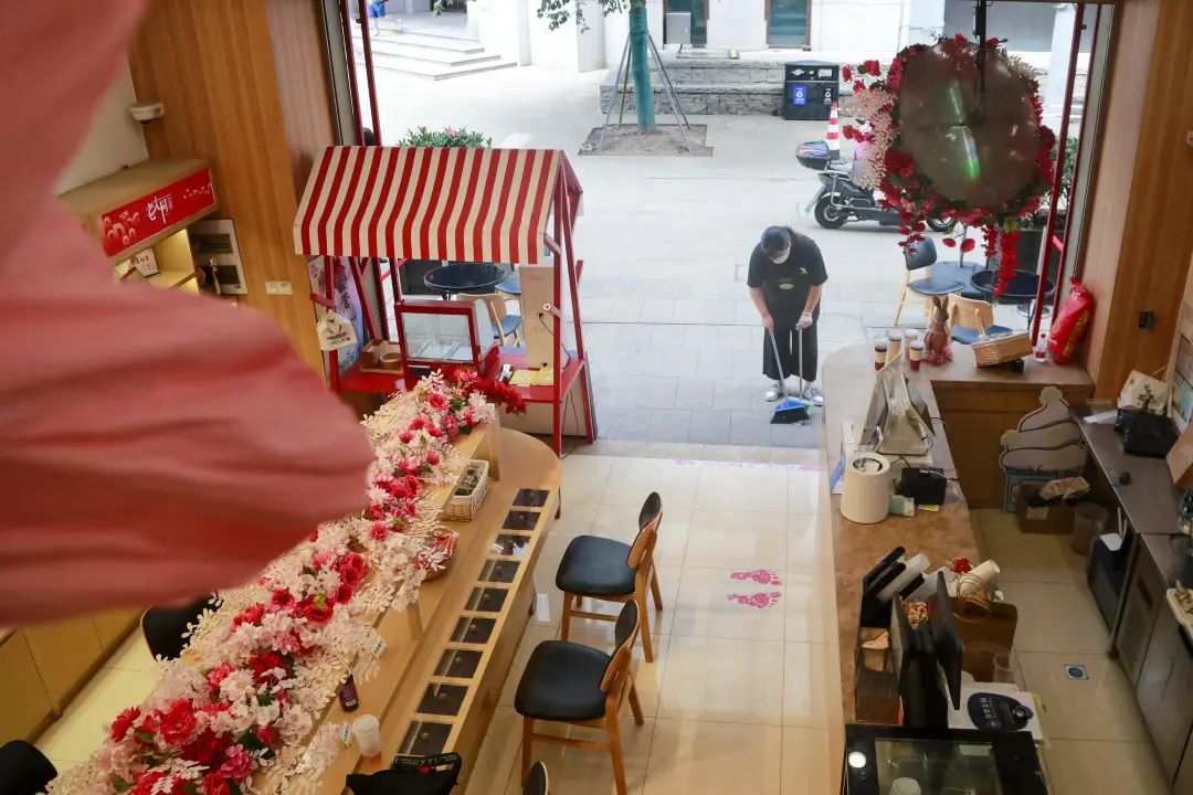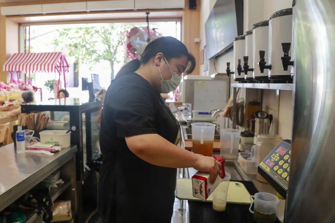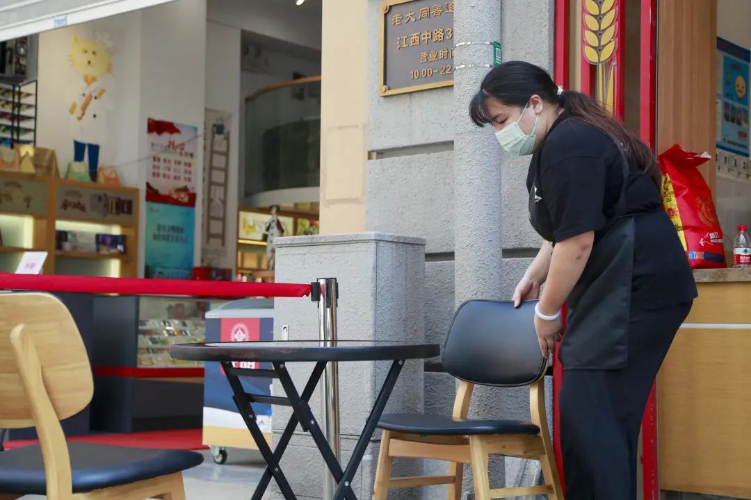 “现在正好是暑假,作为上海必打卡的景点,这里游客很多。”杨玮倩擦拭着店门口的各个角落,告诉记者:“我的主要工作是收银、制作饮品以及室外外摆区的清洁,别看是在室内,但由于店铺是敞开式的设计,没有玻璃门,室内的工作区总是有室外的热风吹进来,动一动就是一身汗。”越靠近门口的工作区温度就越高,有时候甚至会超过三十度。