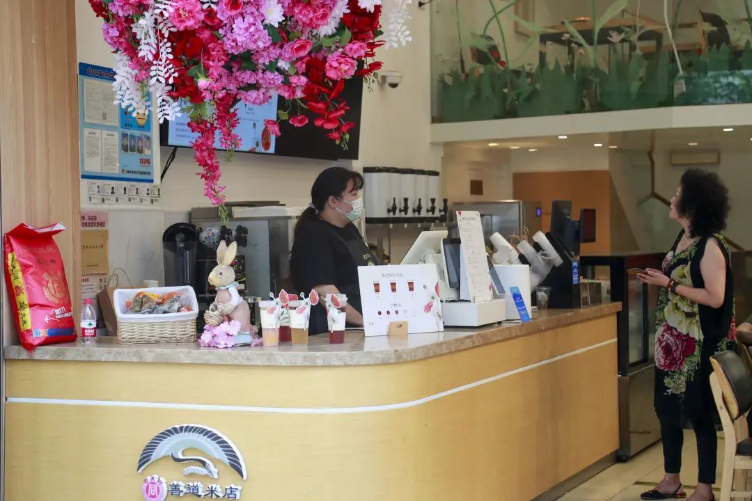清扫外场地面、将外摆区桌椅摆放整齐、将有污渍的广告牌擦拭干净……上午九点半,老大同善道米店店员杨玮倩已经在店里备好了制作饮料的茶底,开始了一天的忙碌。