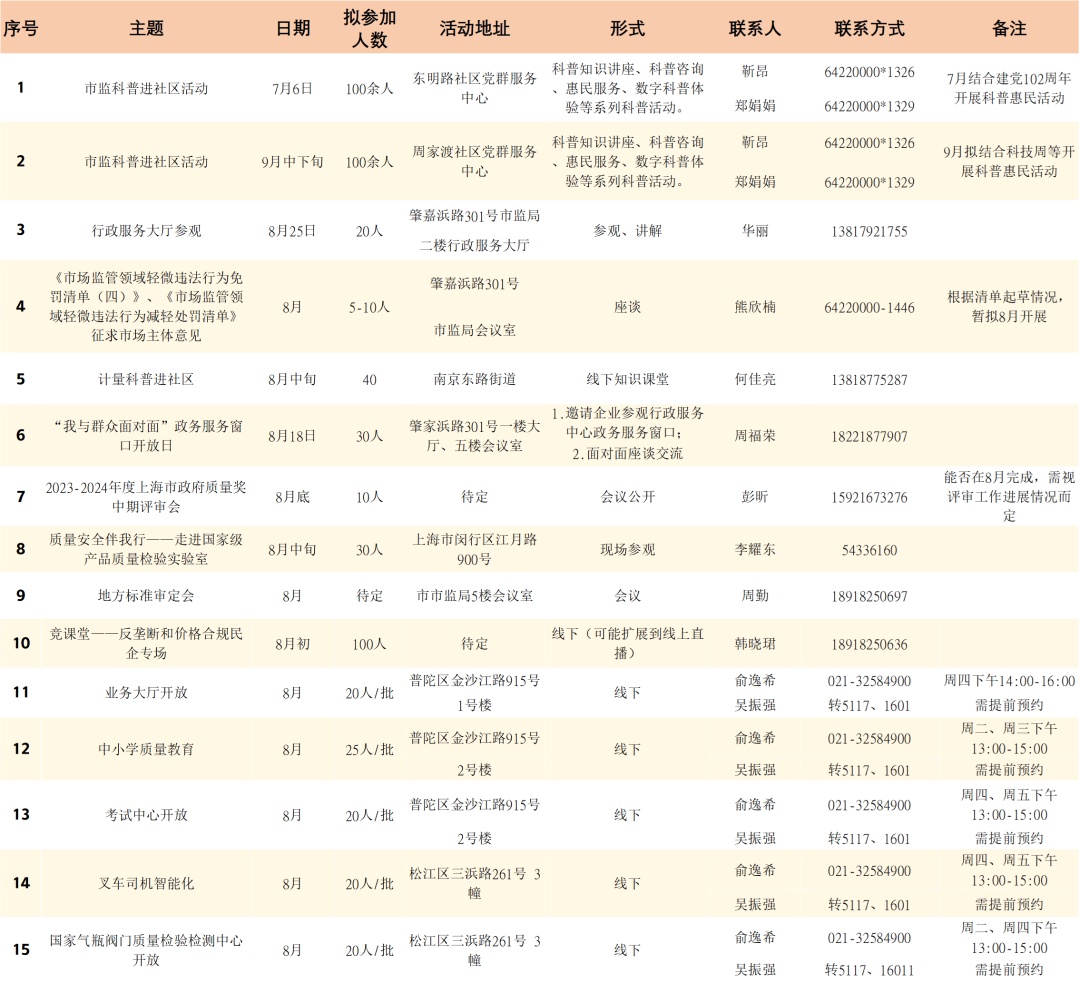 8月,是一年一度的“政府开放月”。为贯彻落实《2023年上海市政务公开工作要点》,市市场监督管理局各处室和下属各事业单位安排了丰富多彩的政府开放月活动,诚邀您参加。