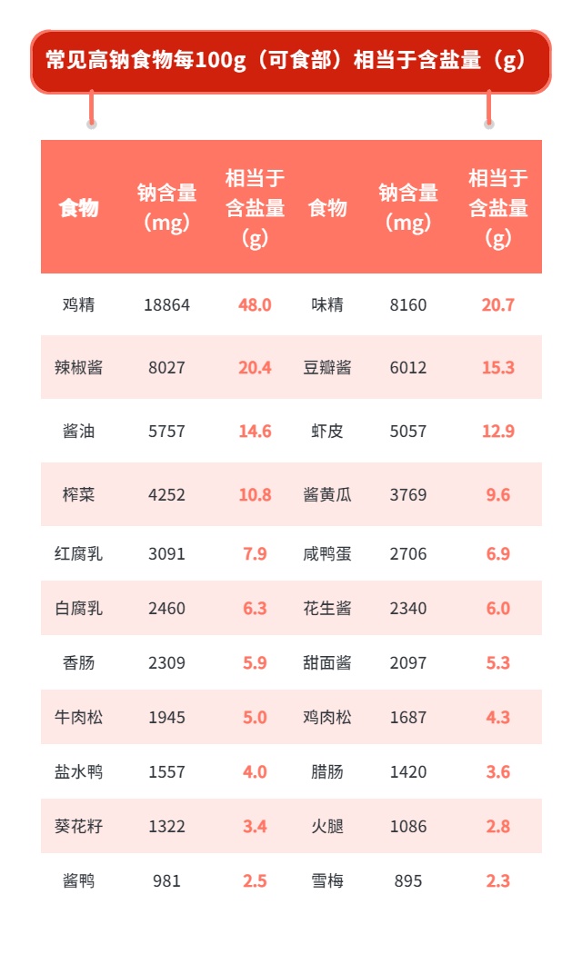 购买加工食品要学会看配料表中的“钠含量”,很多食物都是“隐形盐”食品。比如,火腿、瓜子、咸鸭蛋、榨菜、挂面、甜月饼、白切面包等,它们中有些甚至吃起来并不咸,如甜月饼。