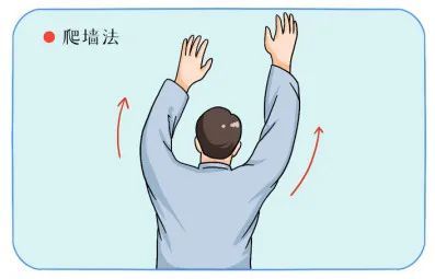 面墙而立,距墙约一臂距离,患臂前伸接触墙面,手指顺着墙壁上爬,达到最大程度时,身体前出一步,如此反复直到脚尖触到墙壁,每日3-5回,每回重复10-20次即可。