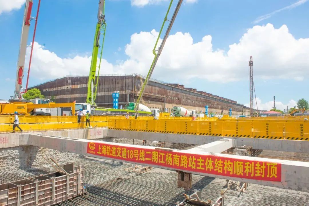 申通地铁集团介绍,7月31日,随着最后一块顶板浇筑完毕,上海地铁18号线江杨南路站顺利完成主体结构封顶,标志着18号线二期工程建设又迈出了坚实一步,为后续盾构区间施工创造了有利条件。详见↓