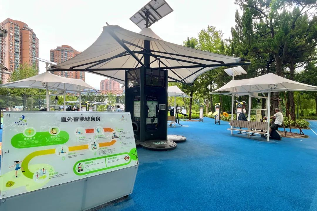 羽毛球场旁边,是一处占地400平方米的全国首套智能室外健身器械,市民可通过人脸识别技术、5G通讯技术,免费获取体测报告和运动处方,数据也可同步从“上海和平公园”小程序中获取。