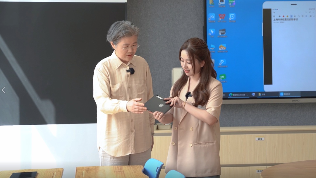 走进上海市宋校嘉定实验学校的一间教室,和记者想象中传统课堂的样子完全不同。课桌椅被排列成分组讨论的样式,孩子们可以围坐在一起思维碰撞,每张桌上都放着一块平板电脑。