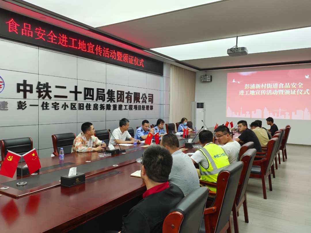 近日,彭浦新村街道食药安办联合彭浦新村市场所来到中铁二十四局集团有限公司彭一工地开展食品安全宣传,并颁发工地食堂食品经营许可证及《静安区餐饮企业落实食品安全主体责任风险管控工作手册》。