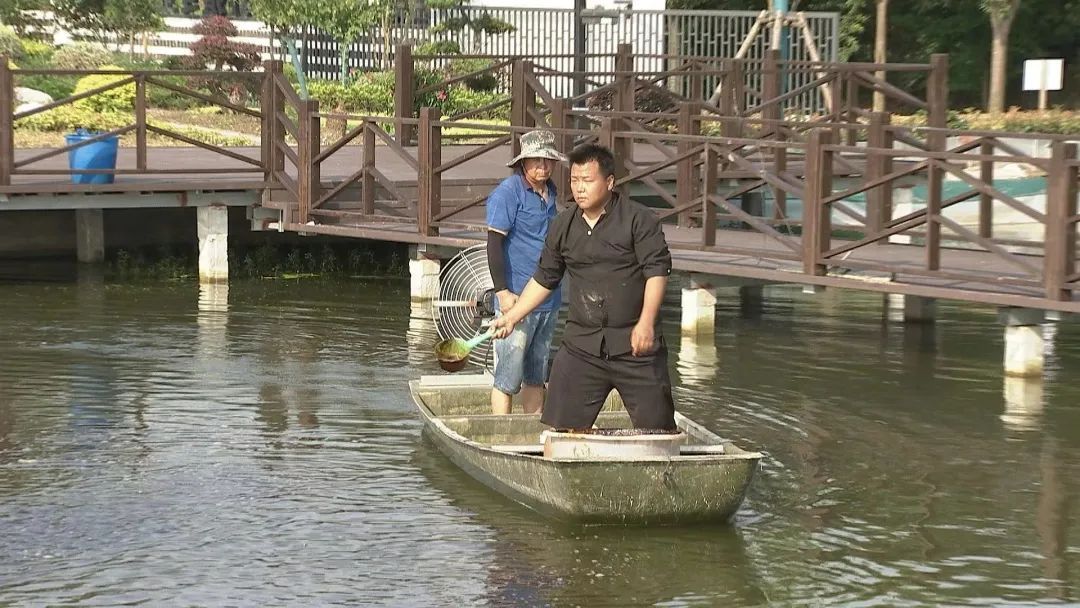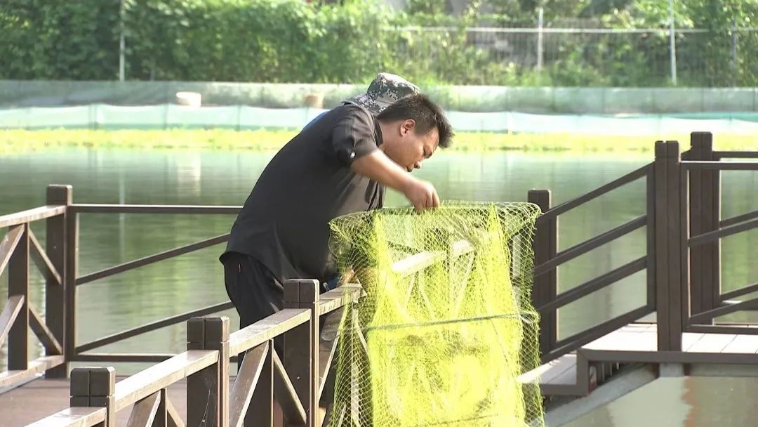 正值盛夏,顾柳滨穿梭于多个蟹塘间,和工作人员一起给螃蟹喂食,不一会儿就满头大汗,但他却乐在其中。