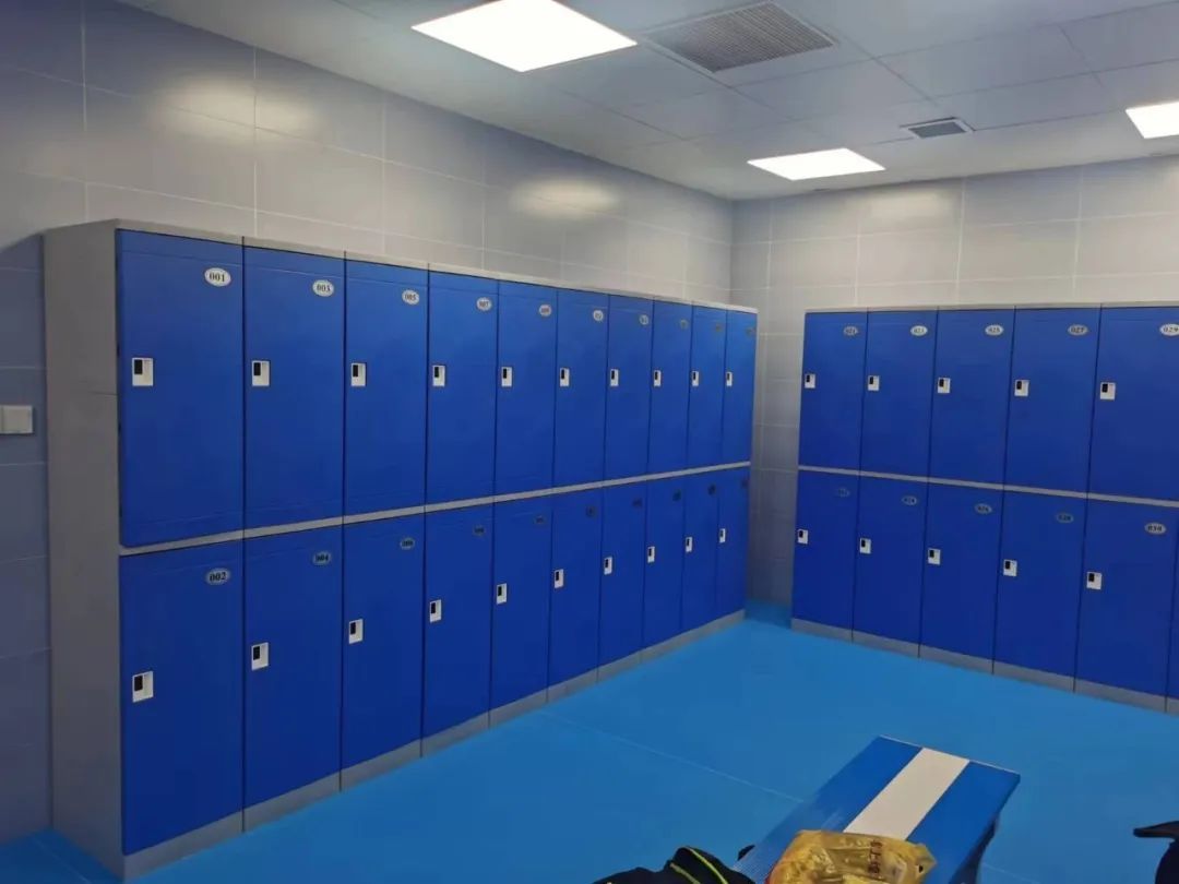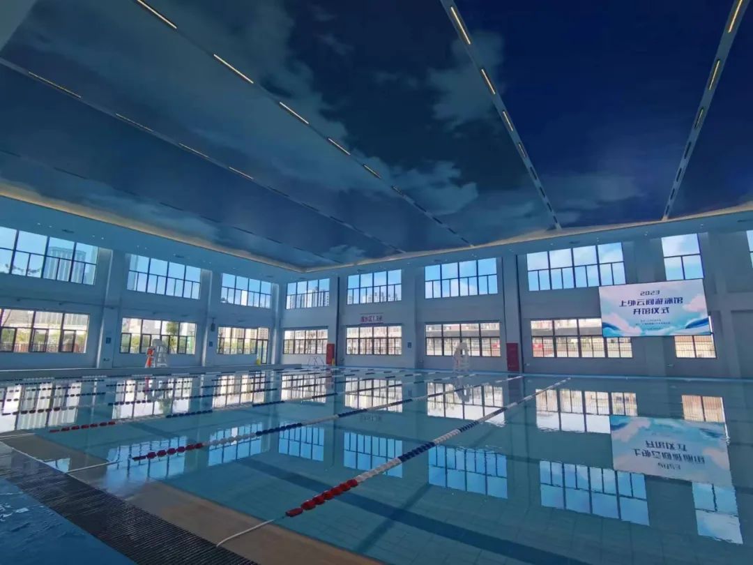 该游泳馆位于上外云间中学东侧,与校内足球场比邻而居,建筑风格也与校园建筑相统一。游泳馆外有配套停车位与新能源充电桩。走进游泳馆,馆内穹顶以蓝天白云装饰,与泳池水面形成天水映衬效果,共设50米温水标准泳道8条。更衣室也以蓝色为主色调。