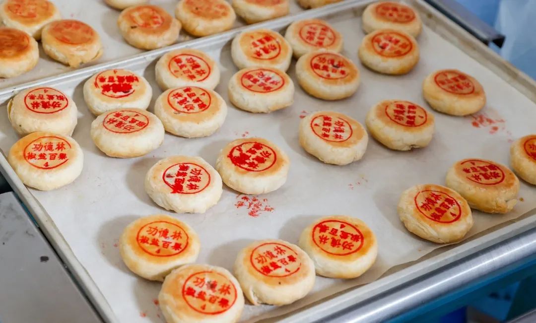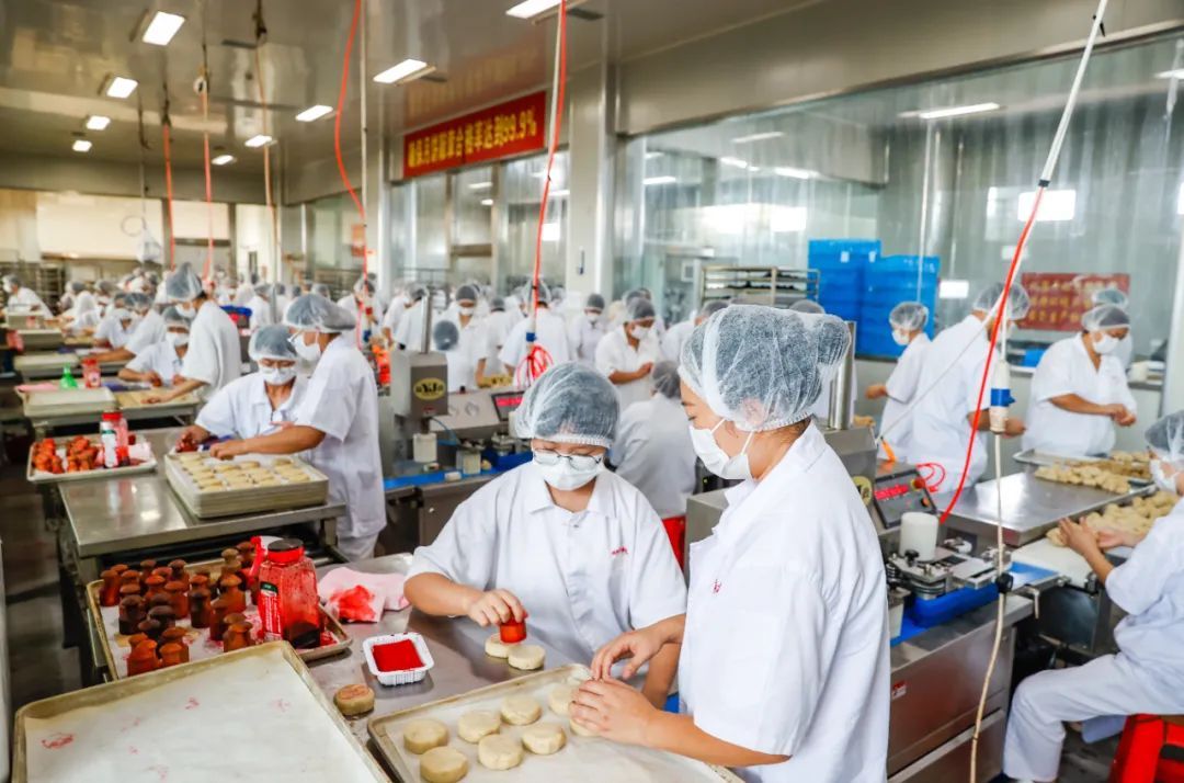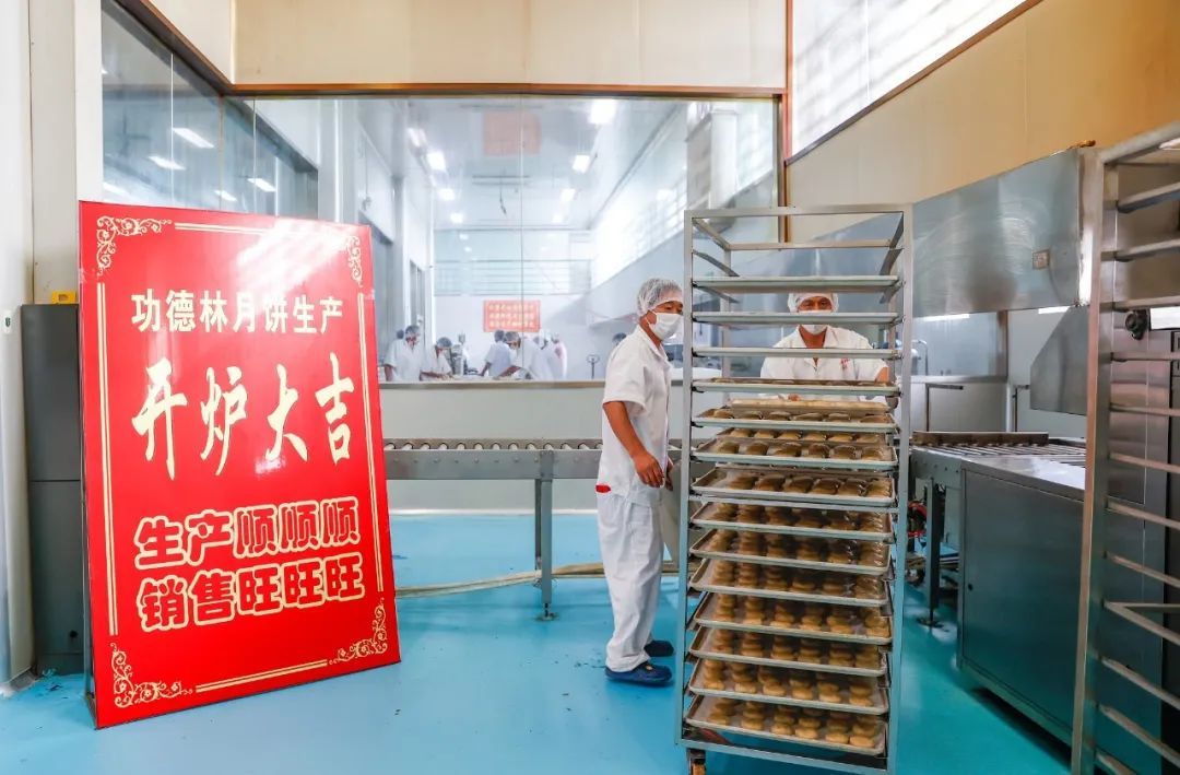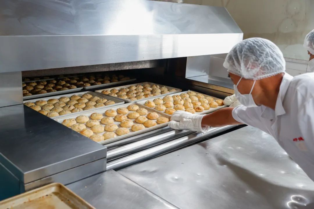 走进生产车间,只见工人们正热火朝天地忙碌着,他们将馅料包进酥皮,捏成一个个圆团,通过机器压制成型后再盖章送烤。烤炉另一头,金黄油润的现烤月饼依次出炉,散发出阵阵香气。