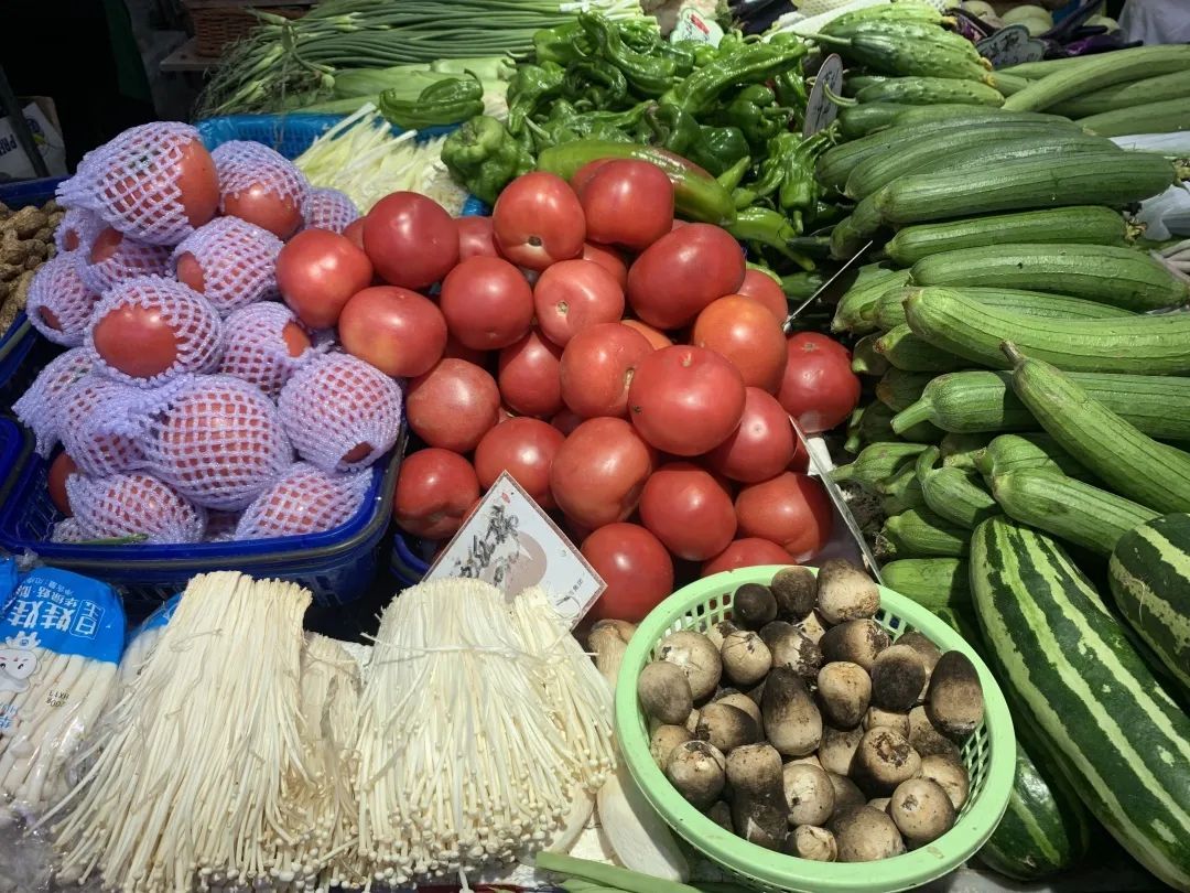 早晨八点的长桥菜市场,已经热闹非凡,不少居民在蔬菜摊位前挑选采购。冬瓜、丝瓜、小青菜等时令蔬菜摆在了较为显眼的位置,色泽鲜艳吸引人目光。