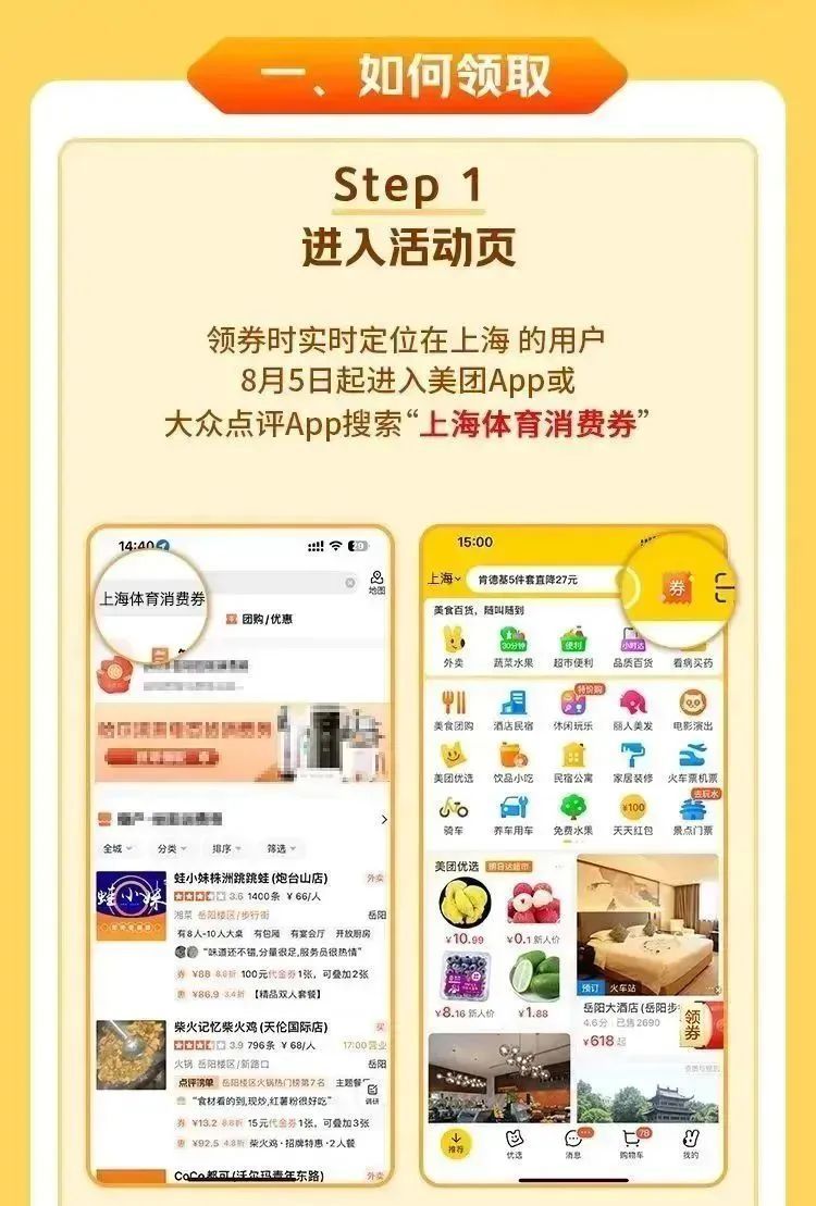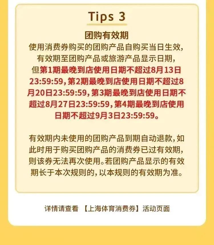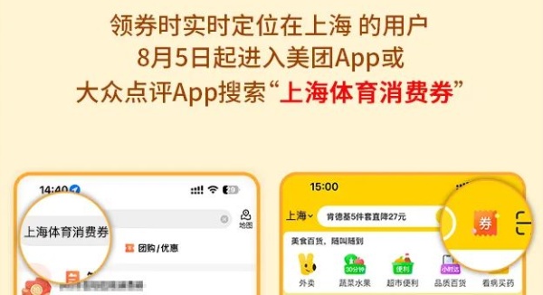 领券之后,消费者可在美团、大众点评App的“上海体育消费券”专题活动页,选择合适的门店,使用消费券购买团购或者进行场馆预订。第一期消费券最晚到店使用时间为8月13日24:00。