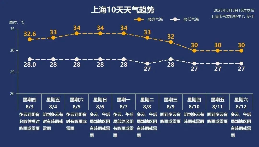 随着“卡努”远离,下周初上海主要受副热带高压边缘影响,以多云天气为主,午后可能出现短时热雷雨。气温有小幅上升,最低气温在27℃或28℃,最高气温在34℃附近,