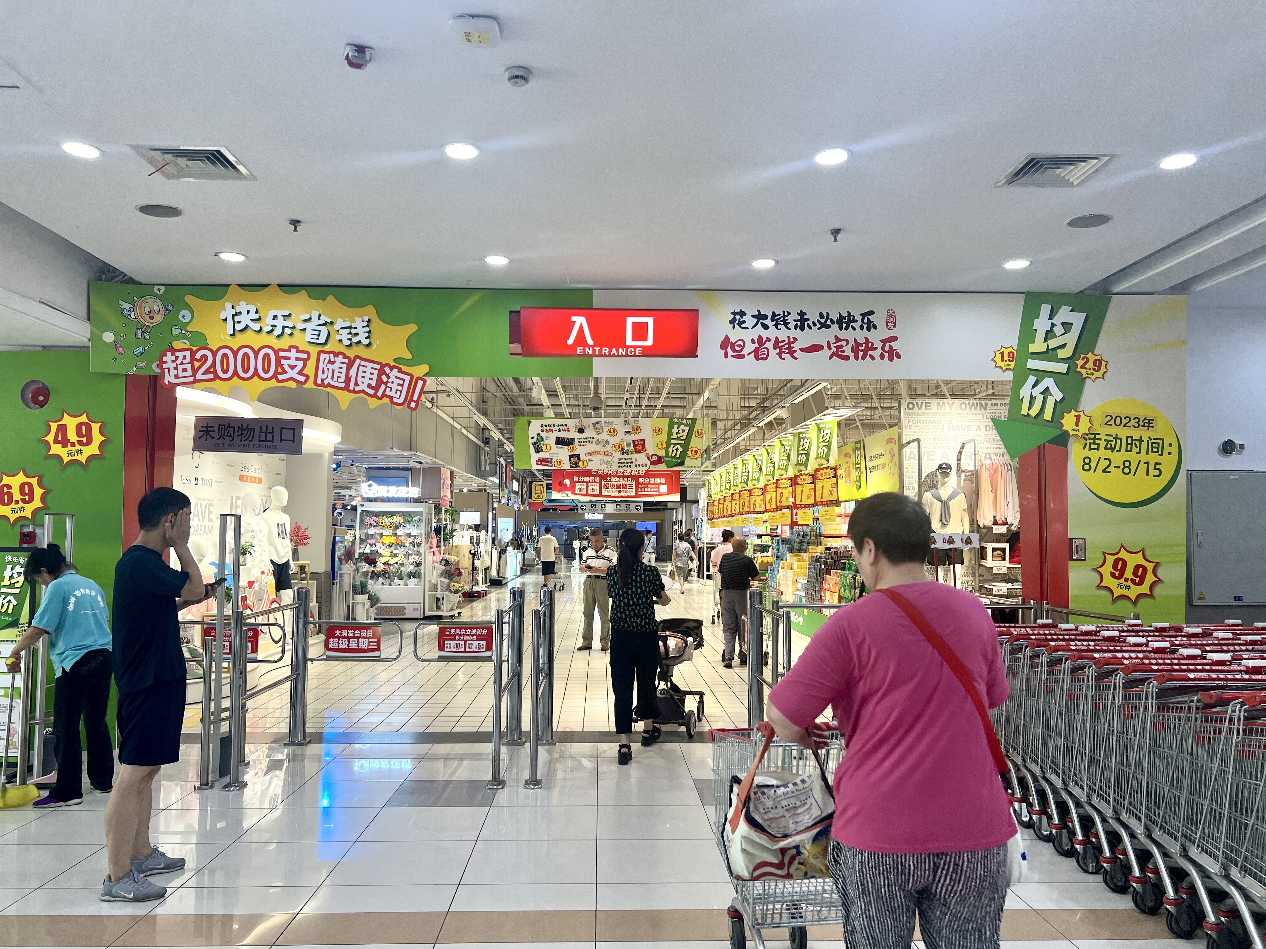8月2日,记者在大润发静安店(闸北店)注意到,门店已挂满“均一价1元”“均一价4.9元”等字样的促销展示牌,并且在超市的“黄金位置”主通道处,陈列了十余个摆满日用品、零食等商品的展示柜及货架。货架上,品种繁多的商品、优惠实在的价格,吸引众多市民群众挑选购买。