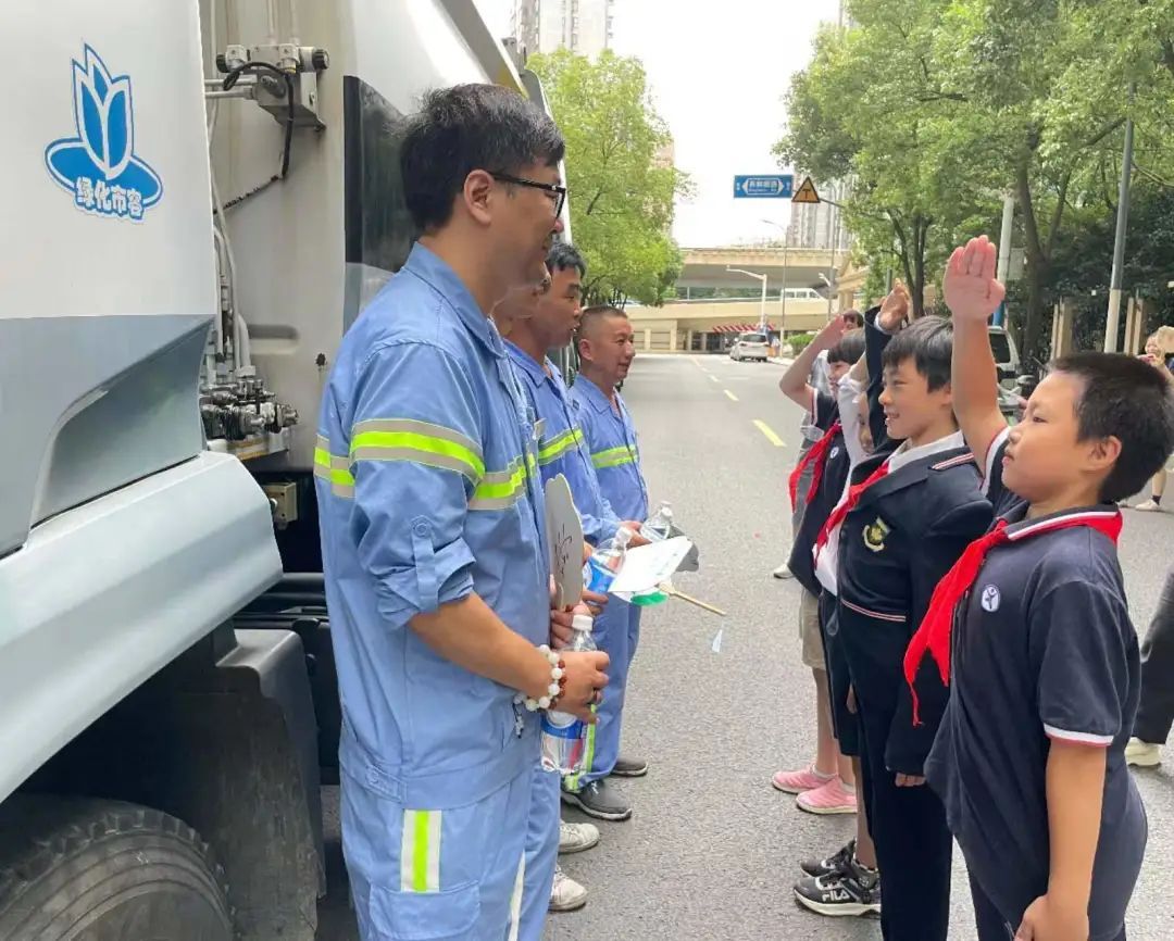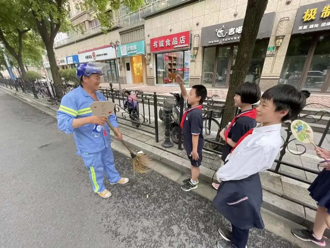 小朋友们将一把把充满爱意的扇子陆续交到环卫工人的手中,向环卫工人行少先队礼,开心地和环卫工人们合影留念。