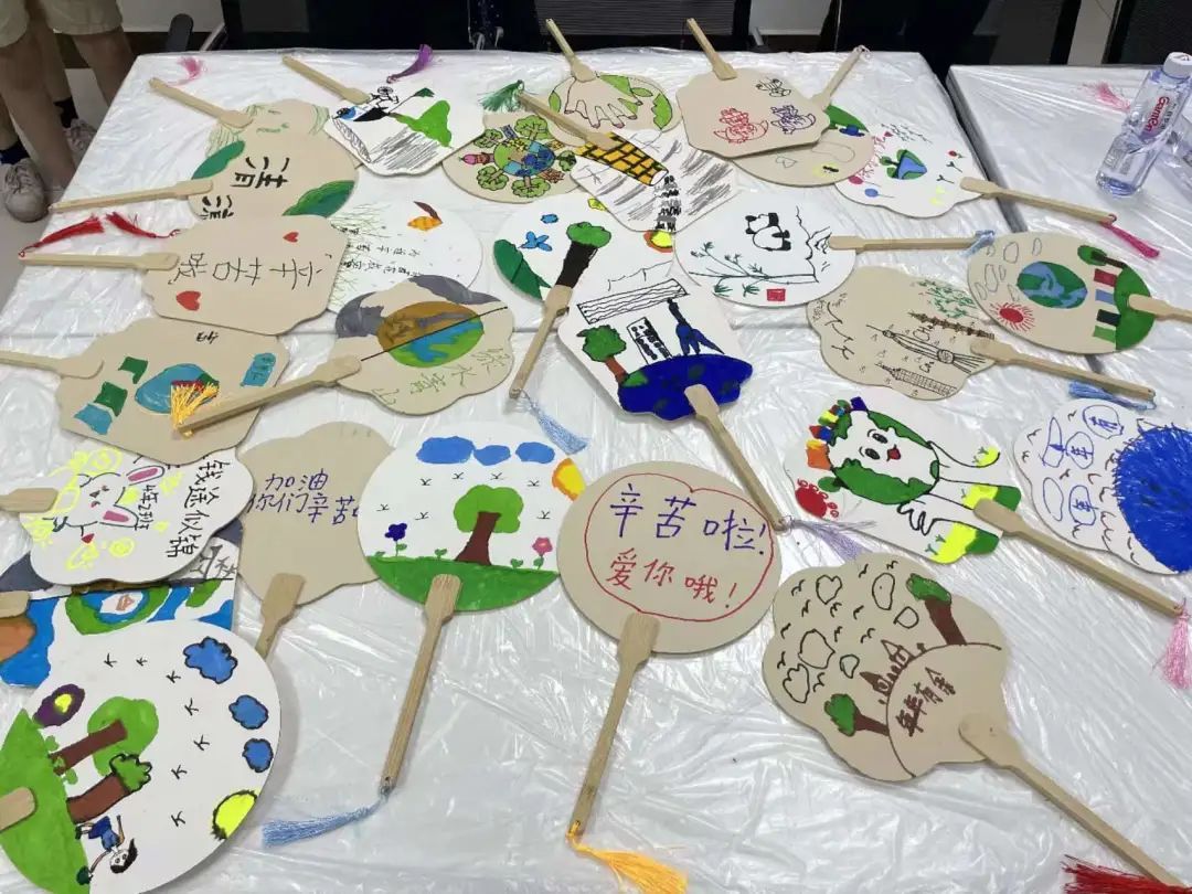 当得知扇子稍后将送给一线环卫工人时,小朋友们非常激动,更加认真地进行创作,在一笔一画、一字一句中表达对环卫工人的敬意。