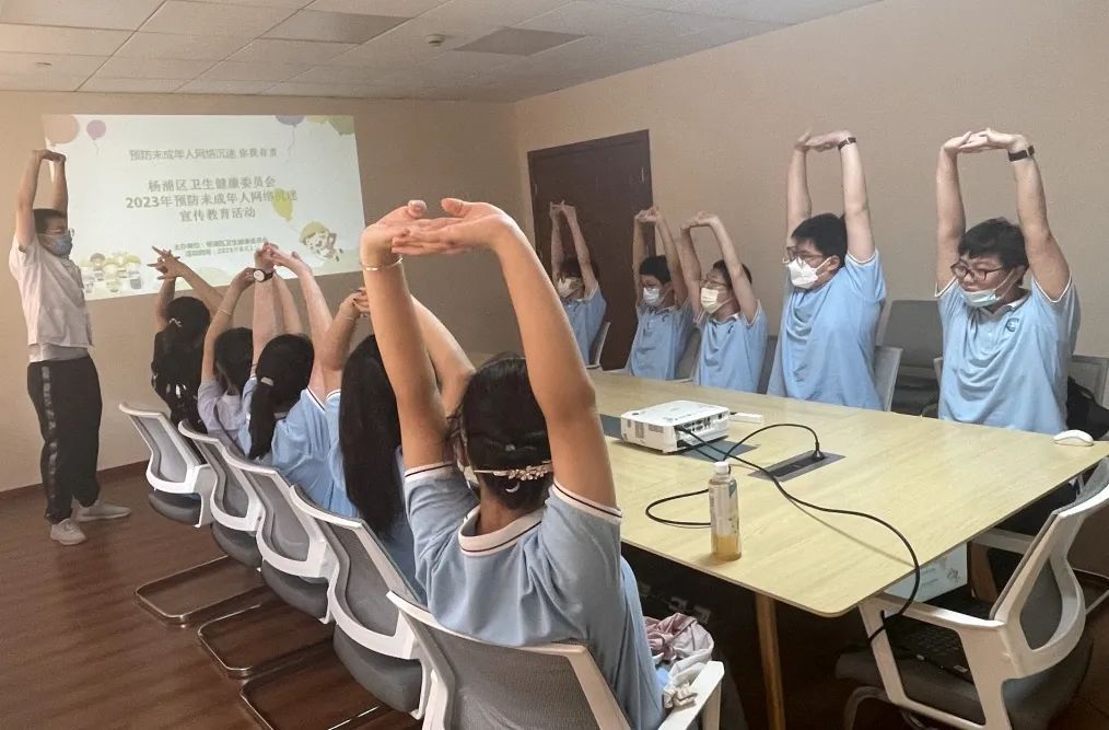 当天,定海社区卫生服务中心康复科张晟医生,为同学们介绍了过度使用电子设备对体型体态和颈椎健康的影响,还展示了“颈椎操”的做法。展示完毕后,张医生带领同学们现场做起了“颈椎操”,以缓解青少年们由于使用电子设备过多导致的颈椎疲劳。