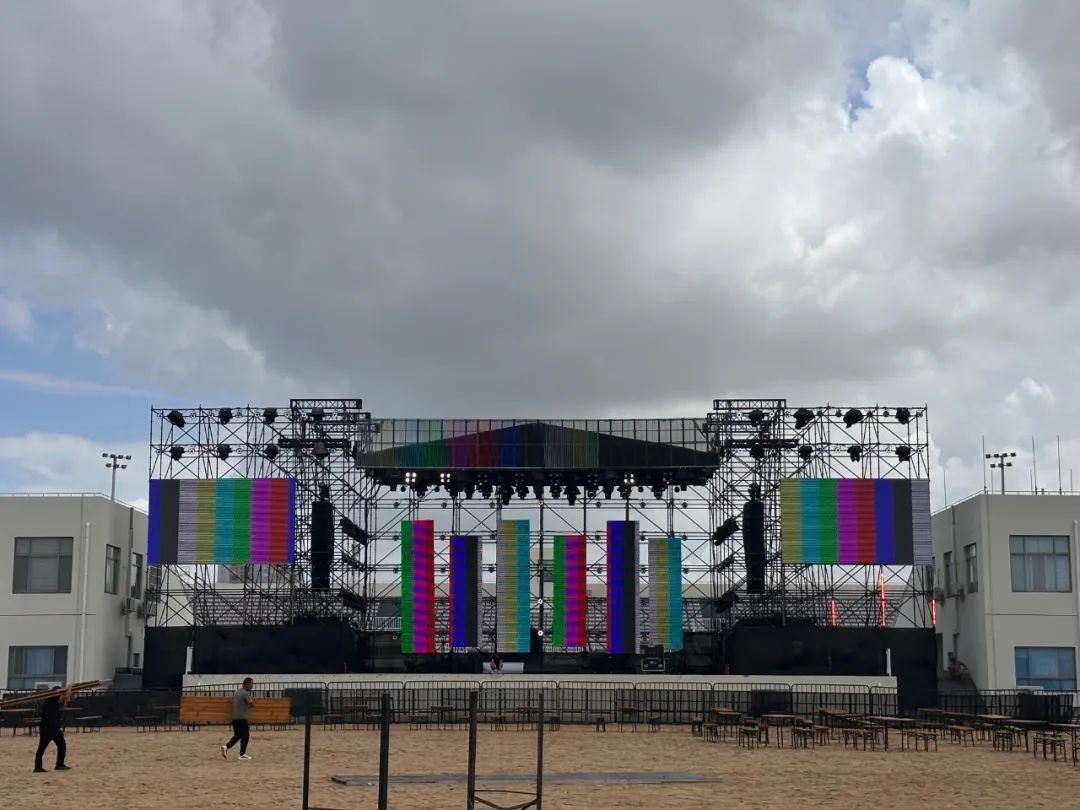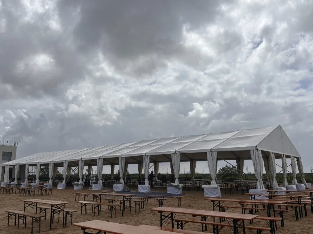 上午9点,在金山城市沙滩可以看到白色帐篷和演出舞台已经搭建起来,工作人员正在进行音响调试和展板安装。