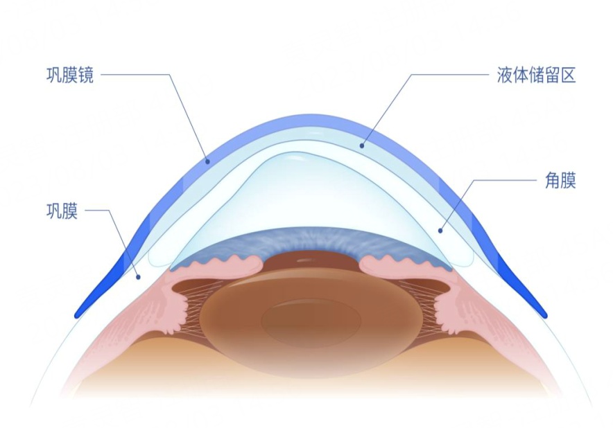 该产品为日戴型硬性巩膜接触镜,是一种大直径的硬性接触镜(俗称“巩膜镜”),镜片材料为氟硅丙烯酸酯(hexafocon A),着冰蓝色。该产品由光学区(OZ)、中周区(PCCZ)、角膜缘区(LCZ)和巩膜着陆区(SLZ)四个弧段组成,在临床验配时可通过对各弧段进行参数调整获得更理想的镜下液厚度,改善患者视觉质量的同时还可保护角膜组织。该产品创新性采用双矢深非对称设计,能够更好地匹配不对称巩膜;巩膜着陆区为反转弧面设计,患者佩戴体验更舒适。