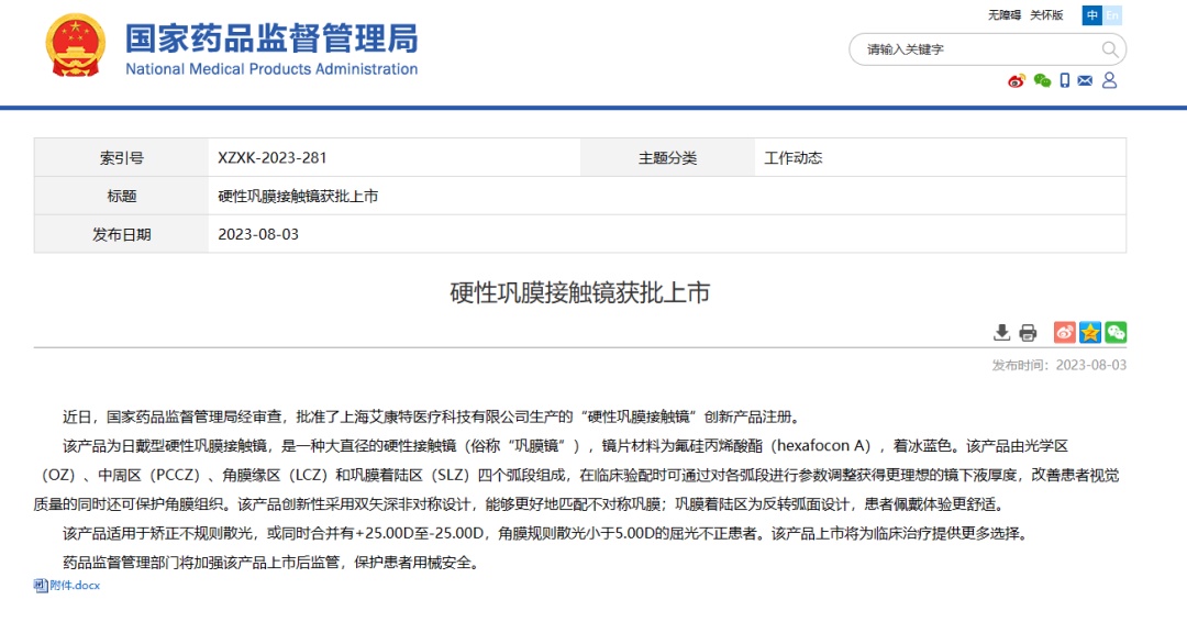 市药监局介绍,近日,国家药品监督管理局经审查,批准了上海艾康特医疗科技有限公司生产的“硬性巩膜接触镜”创新产品注册。这是今年我市获批的第4个第三类创新医疗器械。详见↓