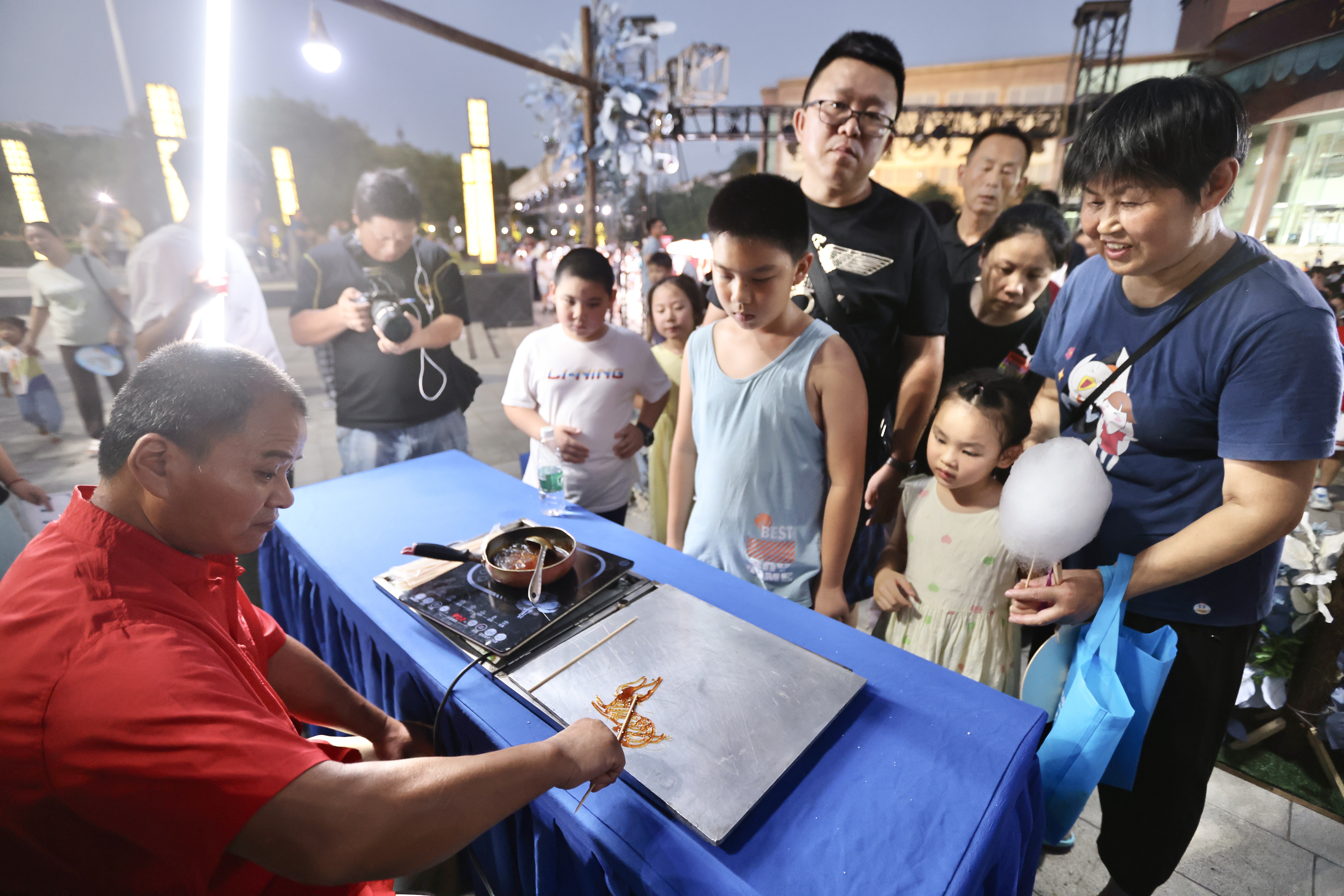夜幕降临,中心文化广场上早已熙熙攘攘。这个夜晚,广场化身为户外公益集市,非遗表演、手工制作等缤纷活动,吸引近千名市民前来休闲和赏玩。书法团扇、剪纸、糖画、泥人、棉花糖……每个特色“摊位”前都挤得水泄不通,人们像“赶集”般走走逛逛,在轻松欢快中感受文化浸润、文明新风。