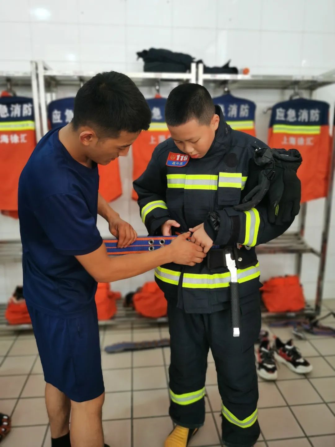 看到消防服装,小朋友们都十分激动,消防员首先给孩子们详细介绍了每件消防服的用途:有的是着火救援时穿的,有的是应急抢险服,还有的是耐高温隔热服……孩子们在消防员的帮助下试穿了消防衣、试戴了消防帽。孩子们真切地体验到消防装备的重量,感受消防员的辛苦与不易。