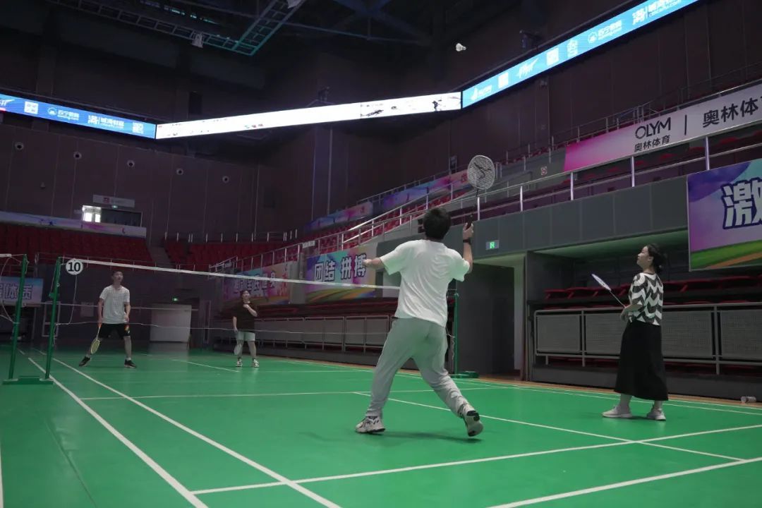另一边的羽毛球场上同样热火朝天。只见市民将羽毛球或轻巧拍过球网、或跳跃进行扣杀,场馆里回荡着拍球发出的声响,现场气氛热烈而欢快。
