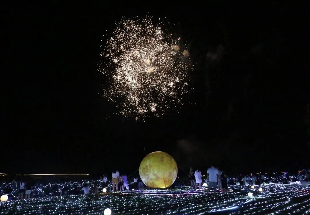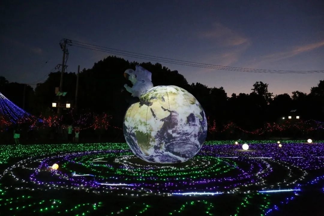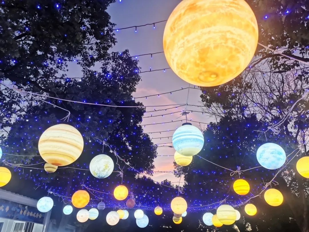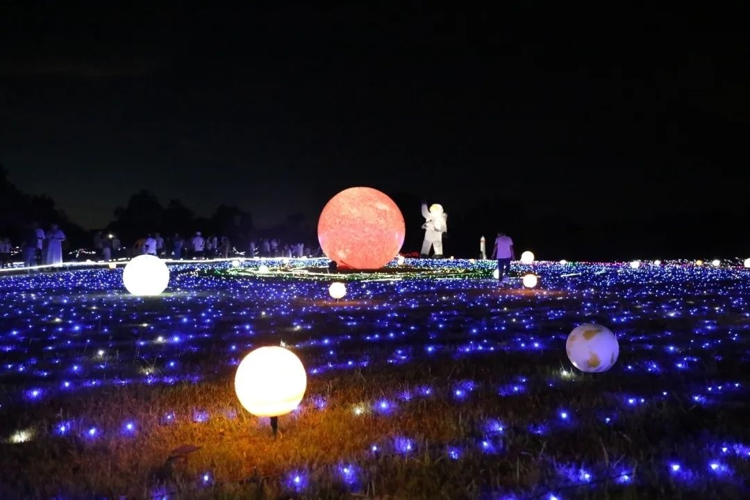 现场更有趣的是宇宙、星空等主题的星球灯光秀。从高空俯瞰,数万平米的灯海夜景,仿佛让人置身奇幻星光森林,数不清的灯盏,高低错落,如梦幻仙境,“科技+光影”完美融合,现场市民游客纷纷拿起手机,记录这唯美浪漫的一刻。