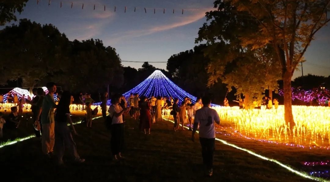 傍晚时分,在廊下郊野公园生态园,游人如织。进入园区大门,利用灯带打造的星光大道、时空长廊、以及十二生肖图、麦穗等主题作品,美轮美奂。五光十色的彩灯主题,带给人们一种全新的夏夜新体验。
