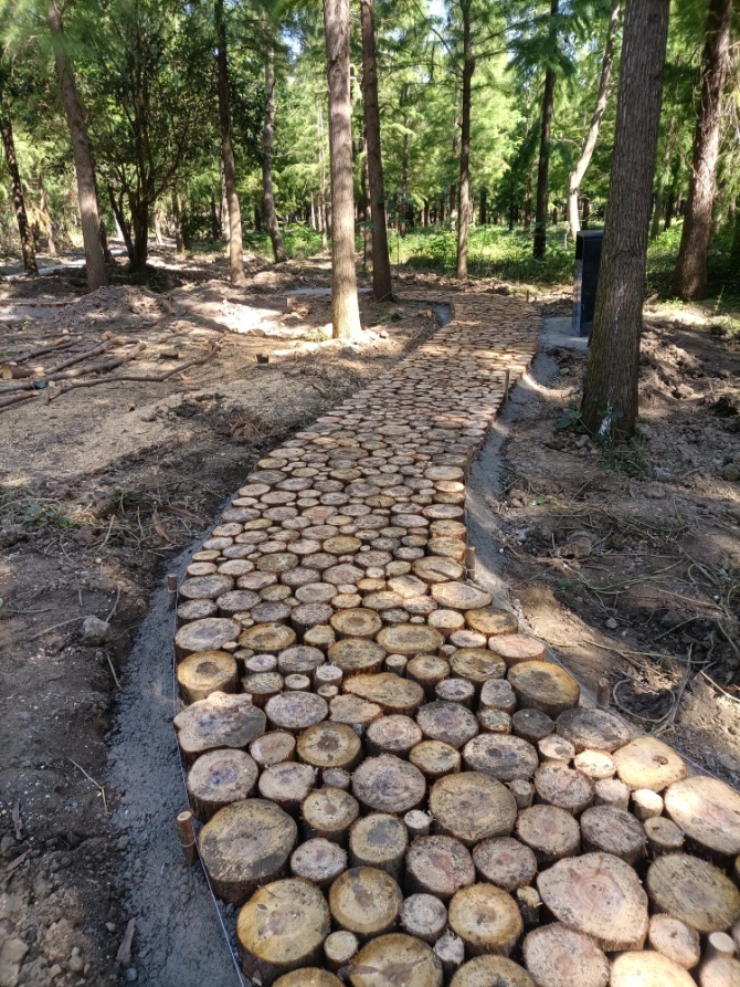 松江区泖港镇开放休闲林地位于泖港镇曹家浜村生态公益林,曹家浜公路以东、齐心路以南、四季路以北,区域总面积为185.15亩。通过对实施范围林区林相结构不合理区域进行生态疏伐、补植、清理等改造,提升林地质量;核心区域林地内配置“四化”苗木,增加花灌木等进行景观提升;增加景观廊架、休憩座椅、石桌凳等配套设施,完善给排水系统,同时配备景墙、驿站、标识标牌、宣传栏等设施,满足老百姓更多样化的需求。巧用树木抚育采伐后的剩余物铺装成林间小道,长度在50米左右,增加了森林野趣,是该开放林地的一个亮点。