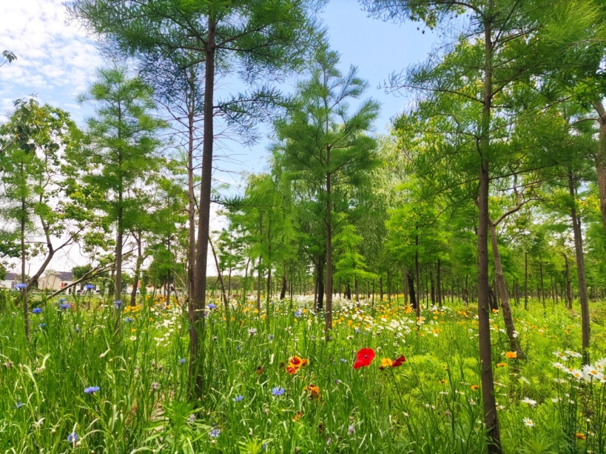 张堰镇开放休闲林地建设依托张堰镇生态片林和玉兰湖、蝴蝶湾等特色林水资源,公益林林地面积共计1131亩,以水杉、银杏、香樟、桂花为常见树种。同时还补种了樱花、红枫、二月兰、紫鹃花、马蔺等开花、色叶植物,合理搭配乔木、灌木、花草,改变原有树种单一、过密的林地,营造丰富多彩、错落有致的“烟雨江南”景观,并将玉兰湖、蝴蝶湾畔作为重点景观区域打造,让原本“看得见走不进”的林地,变为可穿行、可欣赏、可享受的绿色生态空间。
