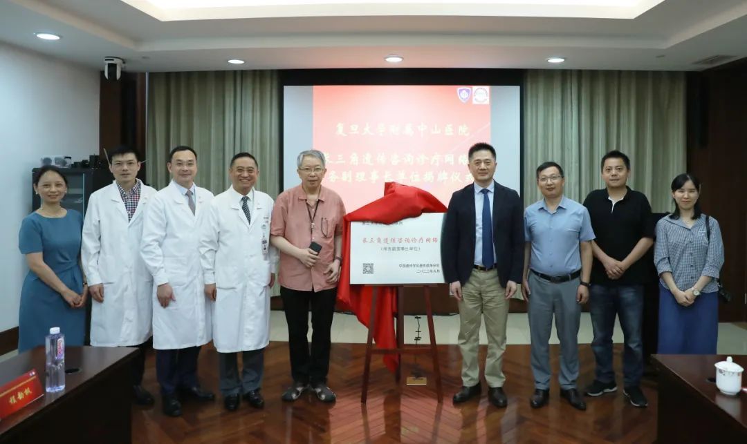 2023年8月6日,长三角遗传咨询诊疗网络常务副理事长单位揭牌仪式在复旦大学附属中山医院举行。长三角遗传咨询诊疗网络发起人贺林院士,中山医院院长樊嘉院士、副院长周俭教授、科研处处长宋振举教授、院长助理高强教授、临床医学研究院副院长程韵枫教授以及长三角遗传咨询诊疗网络秘书长秦胜营等专家参加,本次揭牌仪式由周俭副院长主持。