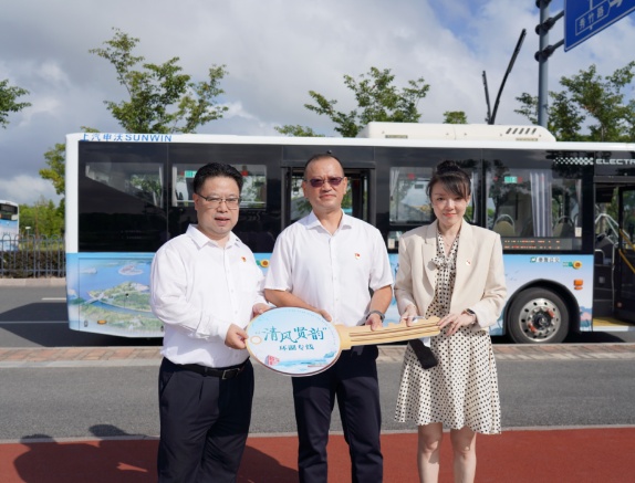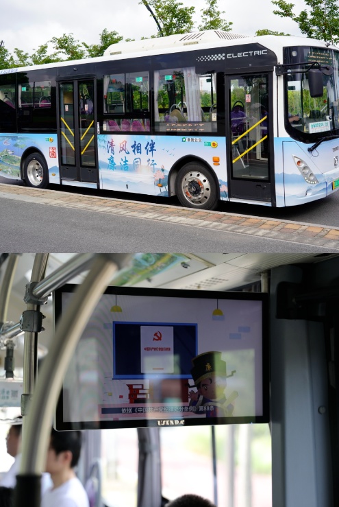 “清风相伴,廉洁同行。请各位乘客上车试乘‘清风贤韵’环湖专车,倾听贤城‘廉文化’,欣赏最美‘贤城湖’。”8月4日上午,由区纪委监委联合区交能集团、奉贤新城公司共同打造的2辆金海湖“清风贤韵”环湖专线在泡泡公园1号门口正式通车运行。区纪委副书记、区监委副主任盛军,区交能集团党委书记、董事长姜忠,奉贤新城党委副书记、总经理董乐及区纪委监委、区交能集团、奉贤新城公司相关分管领导出席,并作为首批乘客试乘廉洁巴士。 图为盛军向区交能集团、奉贤新城公司授通车钥匙 图为区纪委监委、区交能集团、奉贤新城公司相关分管领导向8名“贤城清风宣讲团”成员颁发聘书 “廉石是张弼的传家宝,辞官卸任时,他别无所带,除了一挑行李和三船书籍,唯有一块压舱石”“路虽远,不行不至,让我们以廉洁楷模为标杆,永葆清廉政治本色”......车辆行进时,3名新聘任的宣讲员随车宣讲、分享了张弼、李宏塔等廉洁人物故事。 金海湖“清风贤韵”环湖专线车体以地标性风景及莲花为主基调,车身及车厢内部扶手等均印制了“清风相伴 廉洁同行”廉洁标语,车椅背后布设了贤城清官廉吏故事的图片及二维码供乘客扫码收听了解,车内电子屏滚动播放着《廉小贤纪法》动漫微视频、廉洁公益广告等内容,既凸显了地域特色,又寓“廉”于“乘”。 作为奉贤区廉洁文化宣传的移动阵地,廉洁专线途经奉贤博物馆、金海湖地铁站、九棵树未来艺术中心及上海之鱼诸多景点,共计设站12对。首班车是早上7:45,末班车晚上19:00,南线、北线间隔半小时发车,全线9.5公里,单程运行时间30分钟,日均24个班次。广大党员干部群众可在金海路沿路搭乘清廉巴士,感受“进车有廉、落座挨廉、抬头见廉”的良好氛围。
