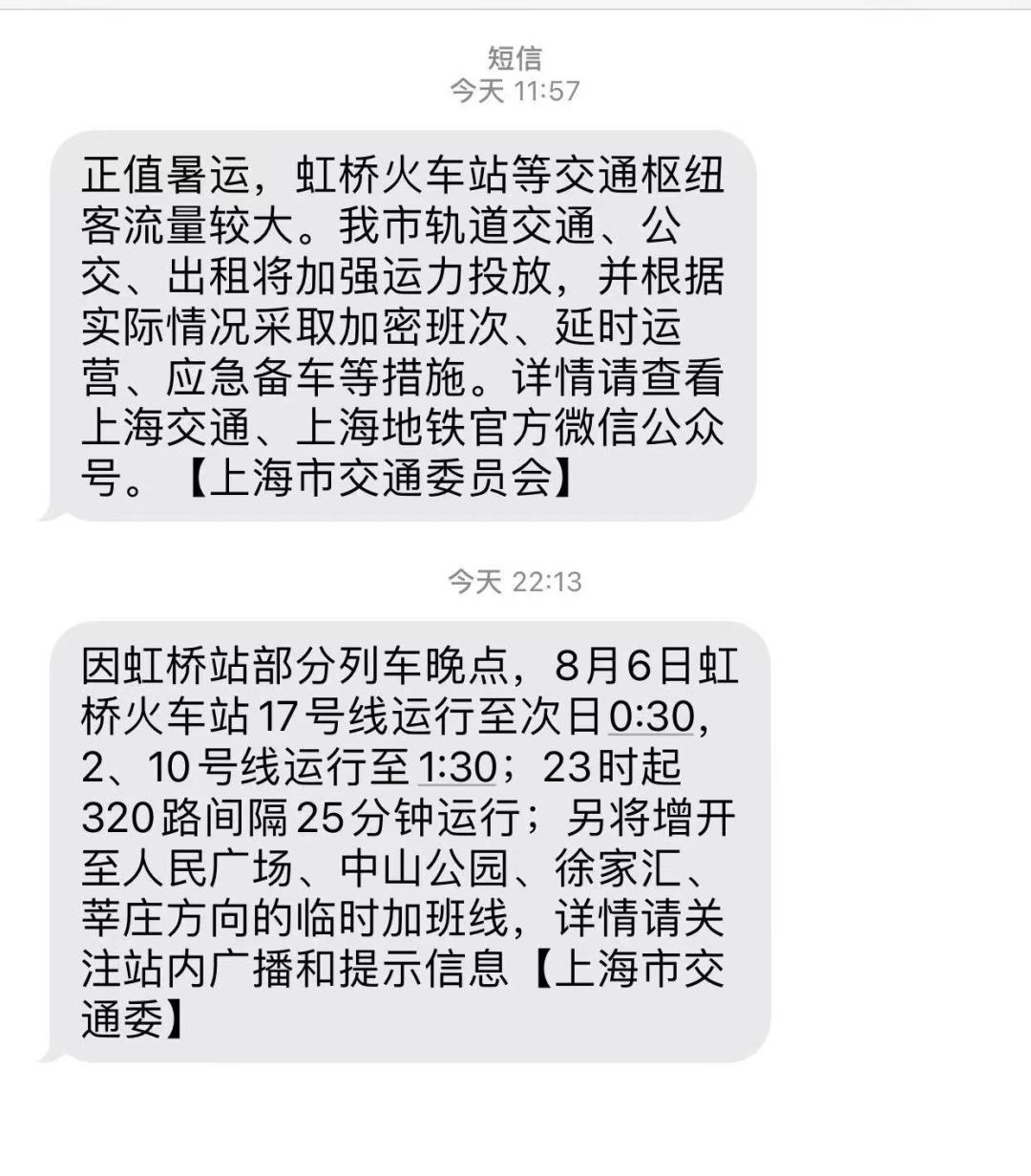 因虹桥站部分列车晚点,8月6日虹桥火车站17号线运行至次日0:30,2、10号线运行至1:30分;23时起320路间隔25分钟运行;另将增开至人民广场、中山公园、徐家汇、莘庄方向的临时加班线。