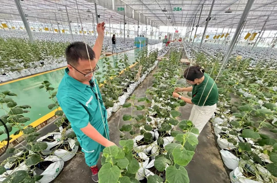 在沙培区,种植着大片白玉黄瓜,这是市面上不多见的品种。“现在已经快到这一茬收获的尾声了,但黄瓜秧还在长,要重新吊。”黄瓜的吊秧和采摘无法实现机械化,也是赵永祥的主要工作内容。