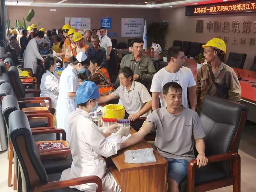 炎炎夏日,杨浦滨江南段的中建三局美团上海科技中心项目工地上“热火朝天”。施工一线的建设者们,正紧锣密鼓地抢抓工期。近日,为了保障工人们的身体健康,中建三局联合上海市第一康复医院,为建筑工人送检上门。