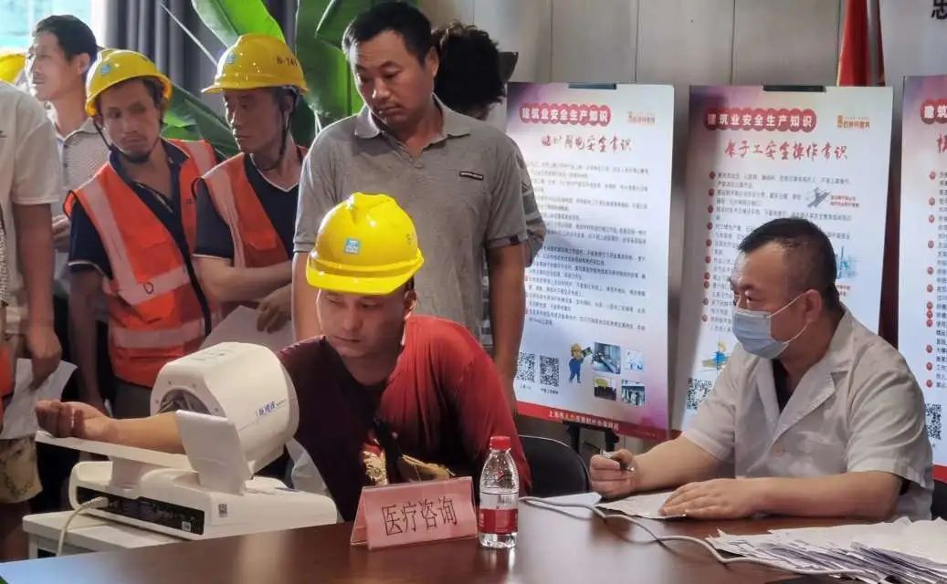 当天,上海市第一康复医院的医护人员来到工地,为近300名施工一线的劳动者们送来体检套餐。体检设置了血压、心电图、血常规等项目。在医护人员的指引下,工人们领取体检表和抽血管,逐项完成健康体检。“我们根据建筑工人的工作特点,对体检项目进行了调整优化。” 上海市第一康复医院门诊办公室副主任张静介绍。