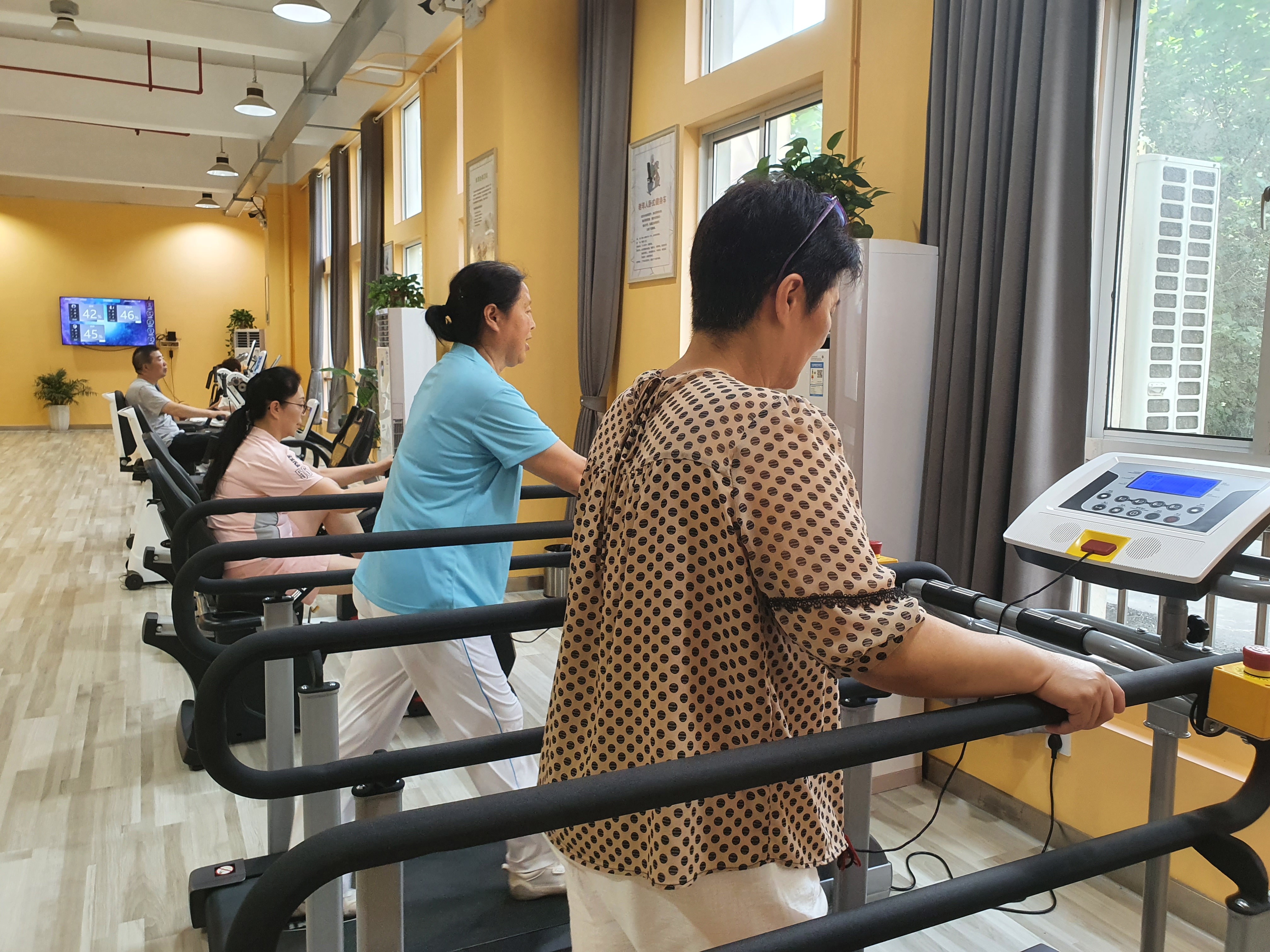 江阴市体育中心全民健身馆,有这样一间特殊的健身房,在里面锻炼的大多是两鬓斑白的老人,没有跑步机上的全速奔跑,没有满头大汗的“举铁”运动,取而代之的是健身老人不急不慢地健走,他们一边拉伸一边开心地唠家常——这个长者运动健康之家,是专门向年满50周岁的女性及年满60周岁的男性健身爱好者开放的银发族健身房。