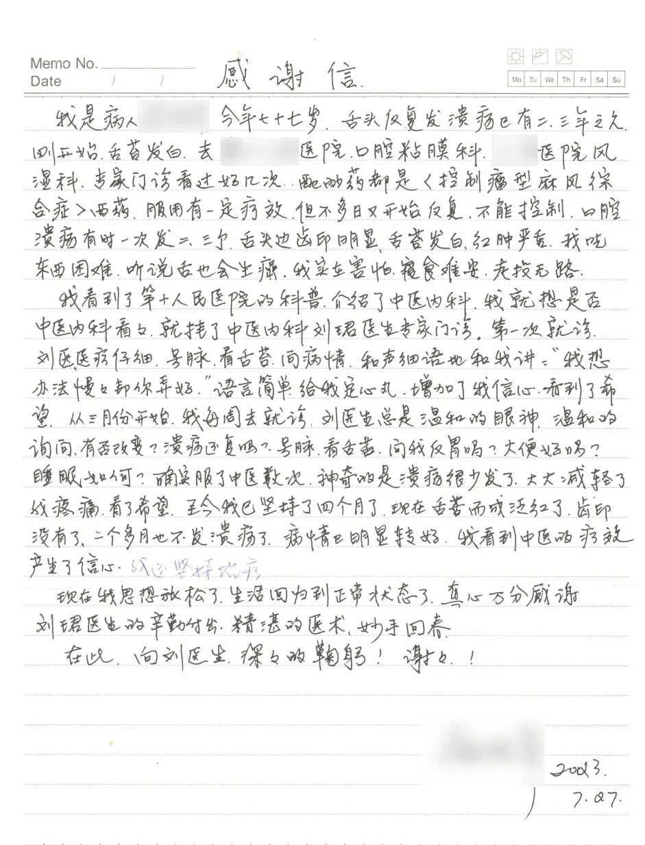 这是一封“挂号”寄来的感谢信,困扰七十七岁患者的并非老年人常见的“三高”、心脑血管病等,而是异常顽固、虽经多方治疗仍反复发作的口腔溃疡。看似“疥癣之疾”,却带来无尽的烦恼乃至恐慌,直到在一次医学科普活动了解到上海市第十人民医院中医科,老人这才看到疗愈顽疾的希望。治疗过程中,该院中医科医师刘珺四诊合参八纲辨证,有效改善了患者症状,并达到“身”“心”双治。