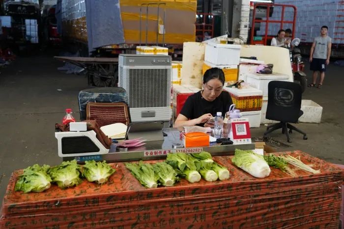 蔬菜经营户杨秀在手机上与客户对接订单,她的摊位前摆着绿油油的生菜、上海青、油麦菜和杭白菜,批发价每斤2元多到3元多不等。杨秀告诉记者,夏季高温对蔬菜运输也是一场“烤”验:“为了最大程度保证蔬菜的新鲜度,我们从云南基地采摘,再通过冷链运输,48小时内蔬菜就能从云南运到上海。”