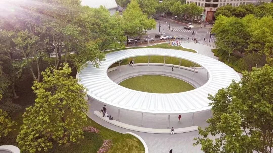 中山公园3号门空间,以百年悬铃木为核心打造了一片绿草茵茵的梧桐广场,广场上新增了特色亭廊。人们可以坐在钩子外形的亭廊里休息,与古树“两两相望”,也可以坐在亭廊外侧的台阶上,以梧桐为背景,欣赏不远处的苏河日落。梧桐广场旁边的中山公园码头在半个多世纪前,曾是梵西渡口,因万航渡路的旧称梵渡路得名,今年5月正式投入使用。