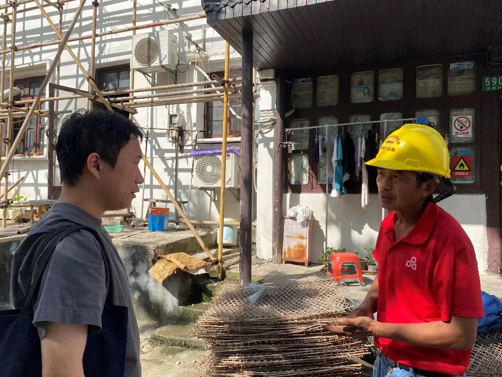 座谈会上,葛隆村书记陈学峰热情详尽地介绍了葛隆村的历史沿革、老街风貌、建筑遗存、典故传说等情况。同济规划院的王博、同济建筑院的贾肖虎、风景园林博士生沈培宇分别就村庄文旅发展、历史建筑修缮维护、林地景观营造等方面提出了专业建议与想法。 会后,调研组对葛隆村域空间和聚落风貌进行了整体考察,在了解村民对于居住品质、服务水平提升的诉求外,也深深感受到了当地居民对葛隆历史底蕴的骄傲与自豪。 调研组正与修缮工作人员交谈 调研组承诺:将认真做好信息整理工作,并如实反映村民、村委对于保护葛隆村历史文化资源、发挥特色文化价值的强烈诉求。葛隆村试点调研工作的顺利完成,为嘉定区特色村落调研普查工作积累了经验,也为更有序地推进工作组织开了一个好头。 葛隆村-村落掠影 萧氏住户 盐铁塘 药师殿 药师殿古井 太平桥 古银杏树 不同时代的特色民居 河畔田园风光 西侧鸟瞰葛隆村落 老盐铁塘河口 东侧鸟瞰葛隆村落 嘉定区典型的“村落-盐铁塘-农田”聚落布局
