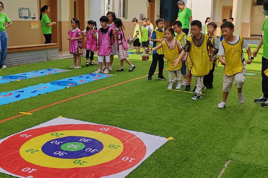 紧接着进入“投沙包”环节,只见小朋友小手一甩,沙包划过天际,扬起一道优美的抛物线,落在前方目标区域内。“耶!我投中了50分!”这位小朋友开心地蹦了起来。