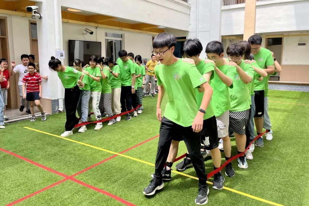 运动会的最后,青年志愿者老师们也加入了比赛。志愿者们六个一组, 用绳子将左右脚绑在一起,进行着“巨人步”的比拼。“一二三、一二三……”在孩子们的加油助威中,他们向终点跑去。