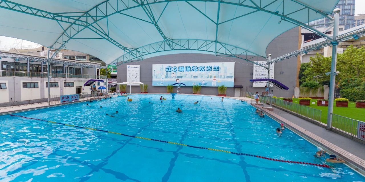 虹口游泳池在虹口足球场附近,距离地铁站230米,从地铁车窗向下望去,便可见到有百年历史的虹口游泳池。在这抹蓝色水波上,五颜六色的泳衣浮动,少见的两头半圆运动场形大泳池,带着浓浓怀旧气息,依然让人们惊艳。