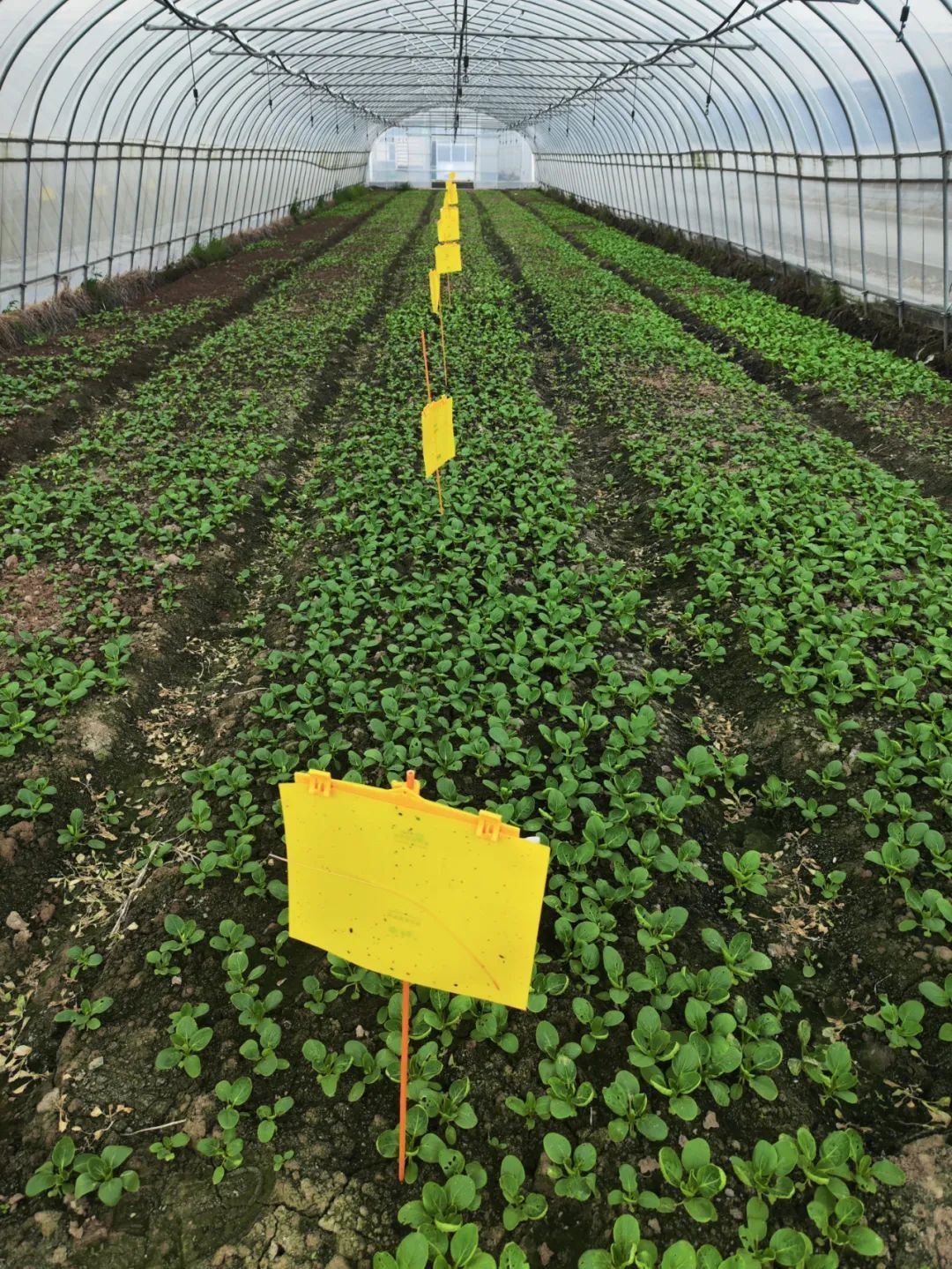 炎热季节,影响蔬菜生长的另一因素便是虫害。小菜苗最怕各种虫子,在大棚内,记者看见了一块块黄色的板,这是专门对付蔬菜的天敌——跳甲、烟粉虱等害虫的。这块黄板也叫色板,是绿色防控技术的一种,利用害虫的趋黄性,并在色板上涂上性诱剂,吸引害虫前往,色板上的黏液会把害虫牢牢粘住,起到杀灭虫害的作用。此外,色板的材料也是采用可降解材料,生态又环保。
