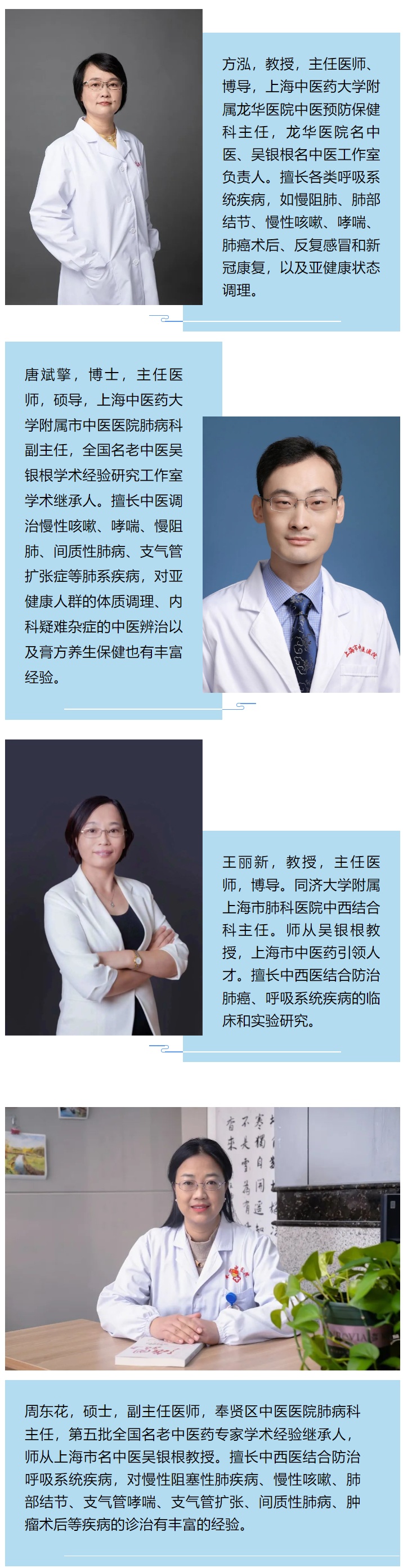 “咳咳咳……咳咳咳……”,咳嗽是呼吸道疾病常见的症状之一,一旦咳起来,或是“惊天动地”,或是痰液堵喉,都叫人非常难受。尤其是长时间咳嗽不好的,精气神都蔫了。为了解决这个问题,区中医医院引进上海中医药大学附属龙华医院吴银根专家团队,破解奉贤居民“久咳难题”。 什么是咳嗽 咳嗽是肺系疾病十分常见的症状,中医常将其作为独立疾病加以论治。现代医学如急性气道炎症、肺炎、慢性阻塞性肺疾病、间质性肺病、支气管扩张、肺部肿瘤、慢性咳嗽等疾病都会出现咳嗽的症状。引起咳嗽的原因错综复杂,“五脏六腑皆令人咳,非独肺也”,处方用药较为困难。 吴银根教授简介 吴银根,教授,主任医师,博导,上海市名中医。上海市吴银根名中医工作室导师、全国第五批名老中医继承班导师。从事医教研工作50余载,出版了8部著作,主编全国研究生规划教材,获专利2项,获中华中医药学会科学技术奖三等奖、上海市科技进步奖二等奖。 吴银根教授创制“咳喘落”“止喘胶囊”补肾纳气,分别用于哮喘的发作期、缓解期治疗;首创咳喘六味合剂,用于哮喘急性期的治疗;创肺炎清解颗粒,治疗新冠肺炎轻中度患者疗效明显;创银翘藿术颗粒,在提高免疫力、预防新冠病毒感染方面做出较大贡献。 工作室主要团队成员 赋能人才建设,提升科研水平 奉贤区中医医院肺病科团队,在上海市名中医吴银根教授及其专家团队的带领下,长期致力于久咳患者的中西医结合治疗,得到了广大患者的一致好评。 中医医院先后有5名中青年骨干医师拜吴银根教授为师抄方学习,工作室定期诵读经典著作、书写读书心得、开展学术讨论、总结名师医案。在吴银根教授的悉心培育和指导下,一人入选第五批全国名老中医药专家学术经验继承人,并取得中医师承硕士学位。 中医院申报市卫健委优势病种培育项目——风温肺热病,通过验收;总结吴教授学术经验申报通过区科委课题——《中西医结合治疗肾阳虚型COPD的临床观察》《吴银根清肺散结汤治疗肺小结节伴焦虑状态的临床观察》。 中医特色项目,提升诊疗效果 针对常见的呼吸系统疾病如肺炎、慢性阻塞性肺疾病、支气管哮喘、支气管扩张、支气管炎等,肺病科在西药常规治疗的基础上,联合使用中药和中医特色诊疗项目,起效更快、疗程更短。 目前开展中医药特色诊疗项目如:耳穴埋豆、中药涂擦、穴位敷贴、穴位埋线、穴位埋植、定向药透、拔罐、经穴推拿等。除了慢性呼吸系统疾病,还开展了肺康复治疗,如呼吸锻炼、冬病夏治、冬季膏方等等。 开设专病门诊,造福贤城百姓 医院开设了新冠康复门诊,致力于促进新冠病毒感染患者在呼吸功能、躯体功能以及心理功能障碍等各方面的整体恢复。对患者进行功能评估,制定康复方案,开展康复指导,并监督执行。康复内容包括中药汤剂、推拿、针灸、引导功法、康复训练配合理疗、情志膳食调整等。 未来还将开设肺结节等专病门诊,在以吴银根教授为首的专家团队指导与帮助下,持续推进科室医教研共同发展,继续提升医疗服务能力和技术水平,更好地为患者服务。 门诊时间、预约方式:周东花副主任医师 周一全天 可在“奉贤卫生”公众号预约。