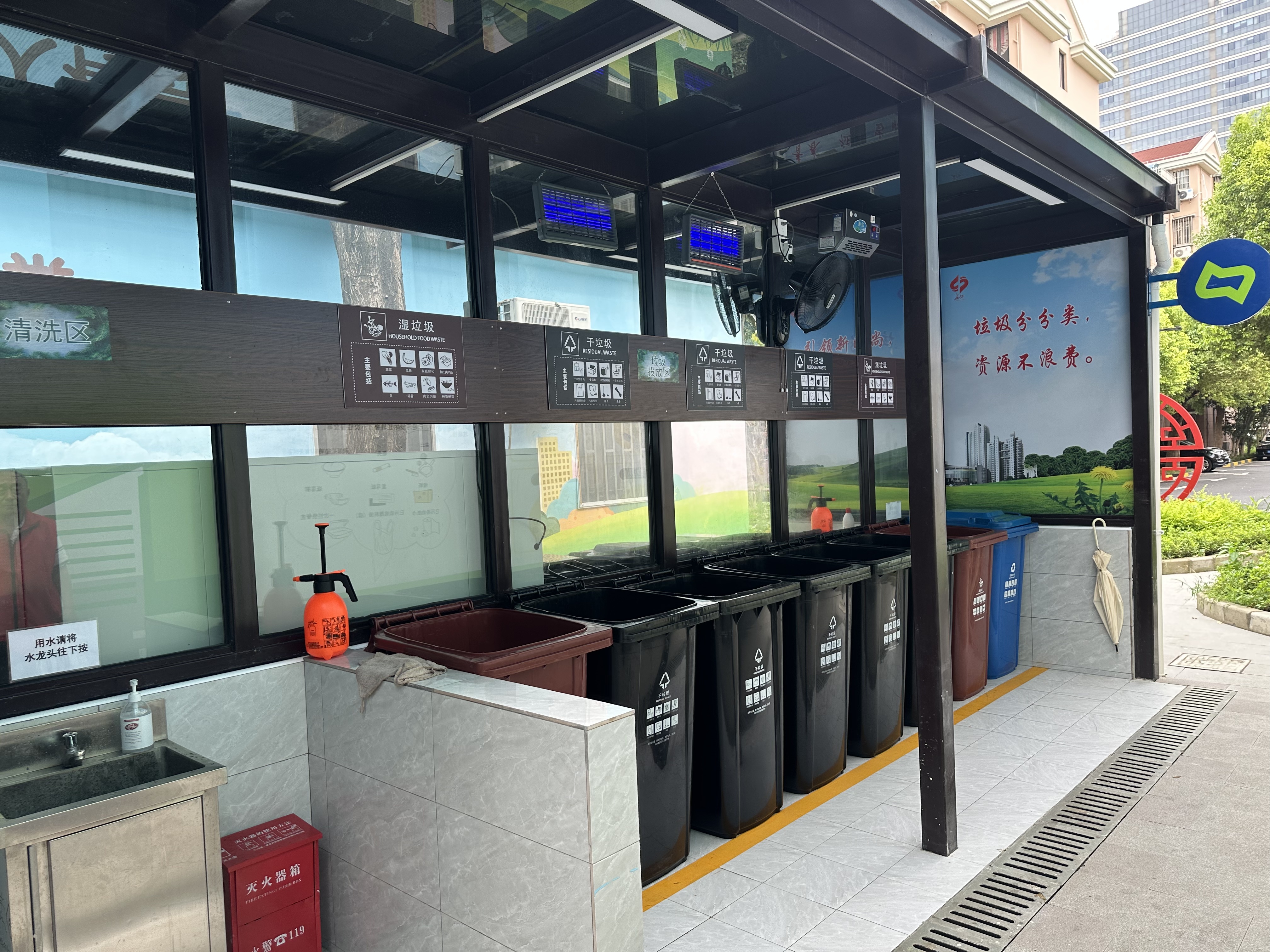 随着小区生活垃圾投放站的顺利建成,困扰了小区居民数年之久的露天垃圾堆放难题终于迎刃而解。而这座生活垃圾投放站也跟当初居委承诺的一样,四周不仅种满了绿植,墙体外围也涂满了别具匠心的彩绘。垃圾分类投放箱上有明确的标语指示,旁边还设有洗手台,贴心放置了洗手液。在垃圾箱上方,还特地安装了空气净化器、灭蝇器、电风扇等各类装置。